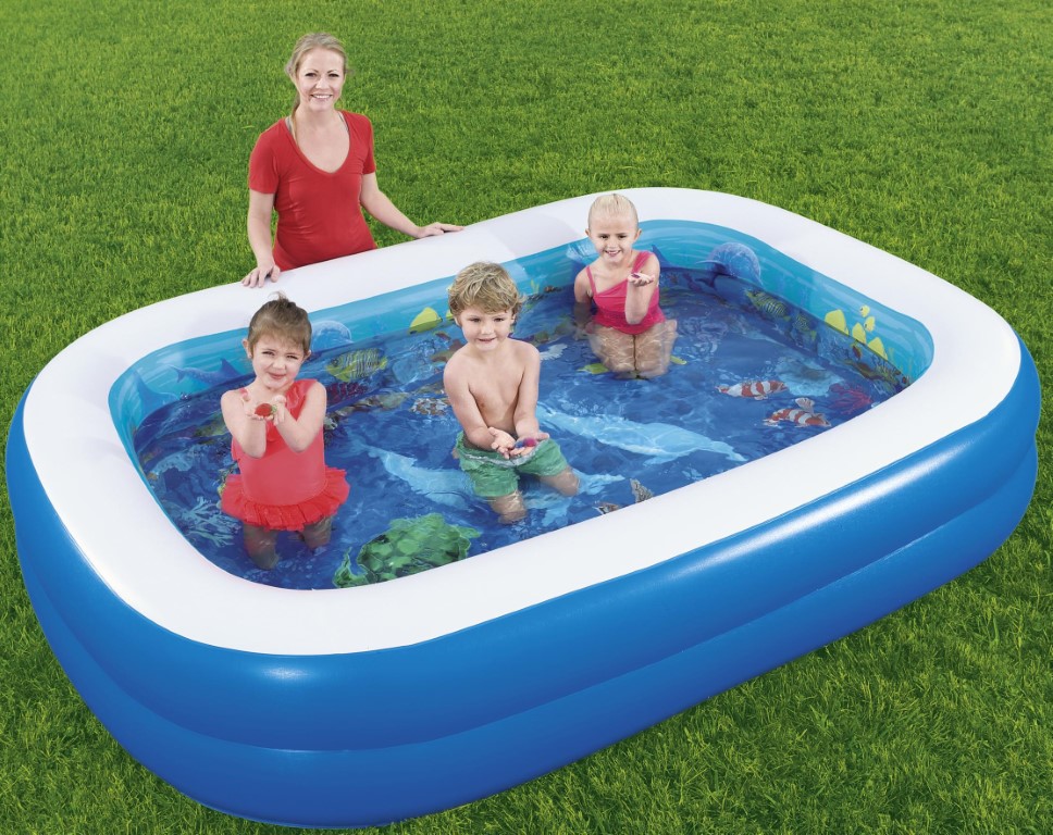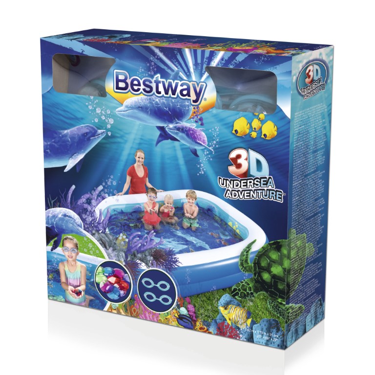 3D Undersea™ Play Adventure Pool on suunniteltu saamaan lapset liikkumaan, urheilemaan ja ulos kotoa. Se on laadultaan testattu, ja sen avulla pääpaino on hauskanpidossa! Tässä altaassa on 2 yhtä suurta rengasta, 2 toisiinsa liitettävää suutinta ja erittäin leveät sivuseinät, joten se on täydellinen allas lapsille. Allas sisältää 2 sarjaa 3D-laseja ja kourallisen kristalliaarteita, joten lapset voivat lähteä omalle aarteenmetsästykselle omalla takapihallaan. Kun olet valmis altaan kanssa, vesi poistuu helposti helppokäyttöisen tyhjennyksen avulla. Allasta voidaan käyttää myös ilman vettä. Leikkiminen auringossa ei ole koskaan ollut hauskempaa kuin 3D Undersea Play -seikkailualtaan kanssa.