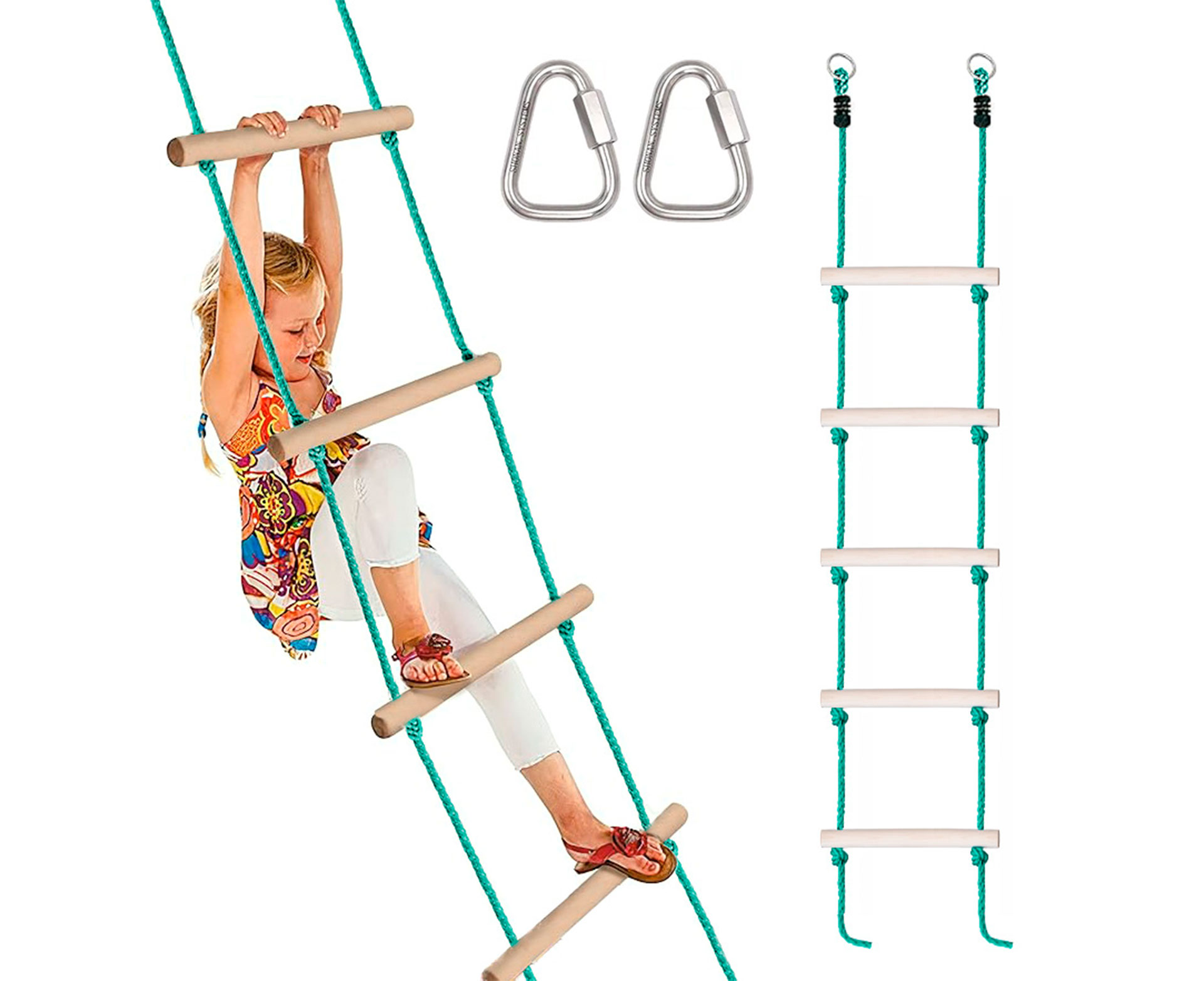 Täydellinen kumppani leikkiseikkailuihin, tikkaat ovat 198 cm pitkät ja niissä on neljä tukevaa massiivipuuportaikkoa, jotka pitävät sinut turvassa. Meillä on myös vahva, UV-kestävä köysi ja kaksi ripustettavaa teräksistä delta-karabiinia. Kaikki mitä tarvitset kaikkeen hauskanpitoon!"