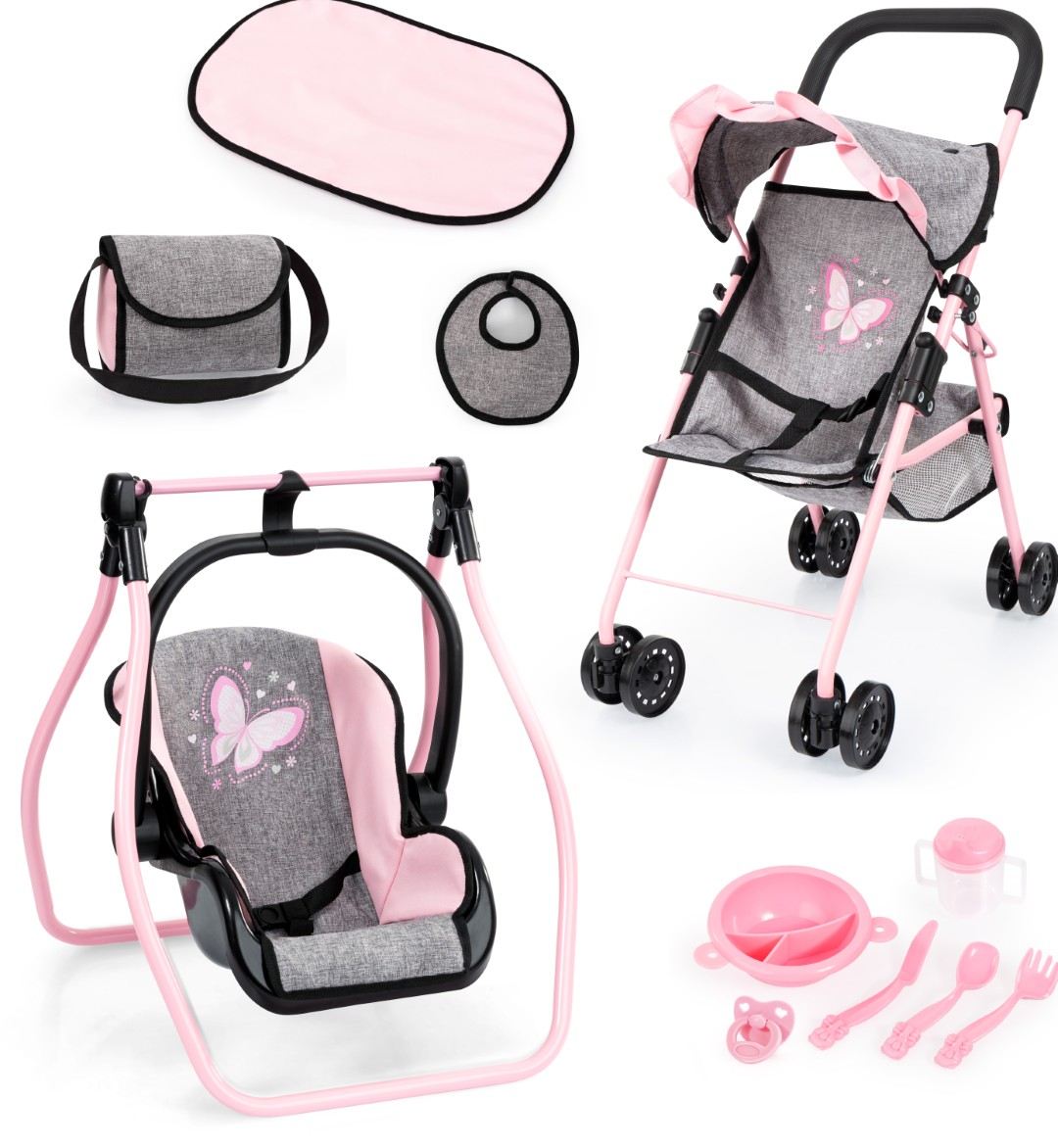 Settiin kuuluu nukenvaunut, olkalaukku, lautanen ruokailuvälineineen, juomamuki, ruokalappu ja hoitoalusta. Kaksoispyörien ja pehmeän kahvan ansiosta nukenvaunuja on helppo työntää.