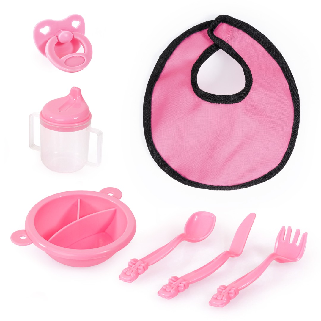 Väriltään yhteensopiva olkalaukku tarjoaa myös lisäsäilytystilaa. Lautanen ruokailuvälineineen, juomamuki ja ruokalappu sisältyvät settiin nuken ruokailua varten. Hoitoalusta tuo lisää leikin iloa. Mukana tulee myös kehto, jossa nukkea voi makuuttaa tai keinuttaa.