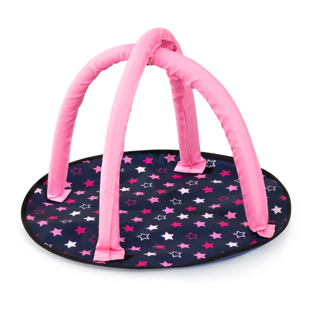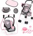 Sisältää nukenvaunut, nuken syöttötuolin, makuupussin, nuken leikkihuovan ja muoviset tarvikkeet.