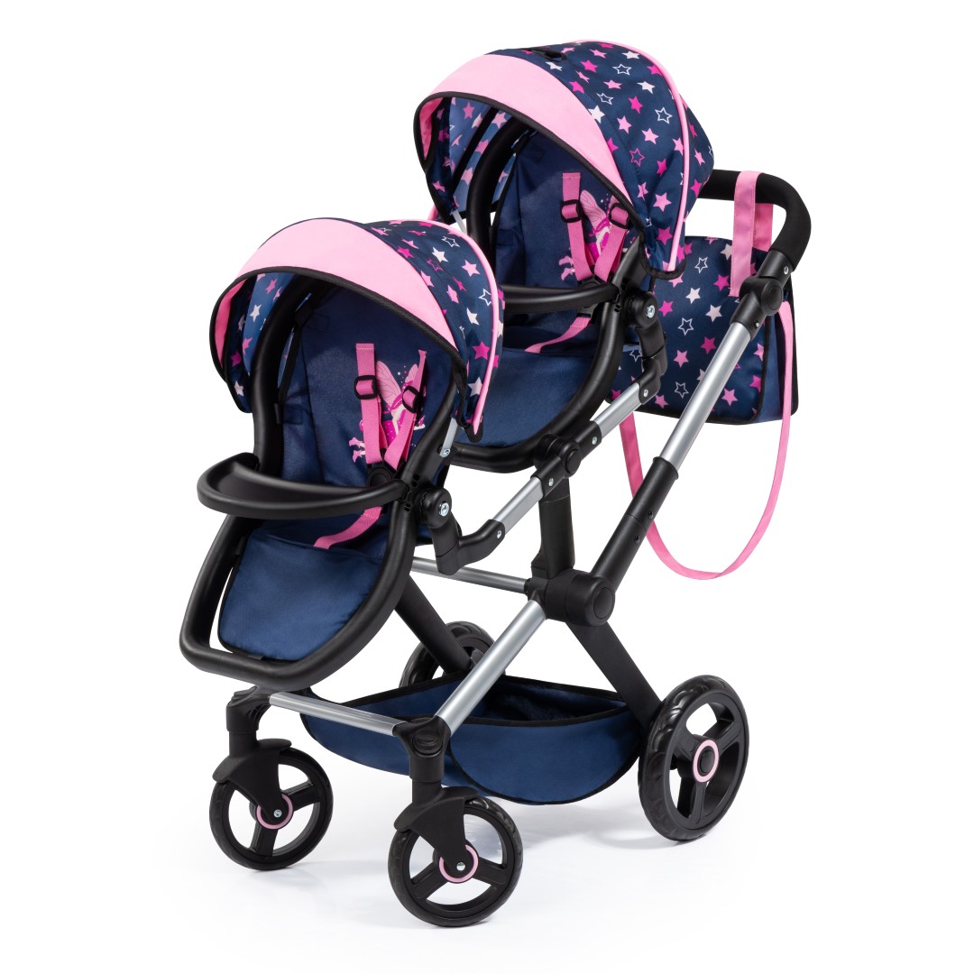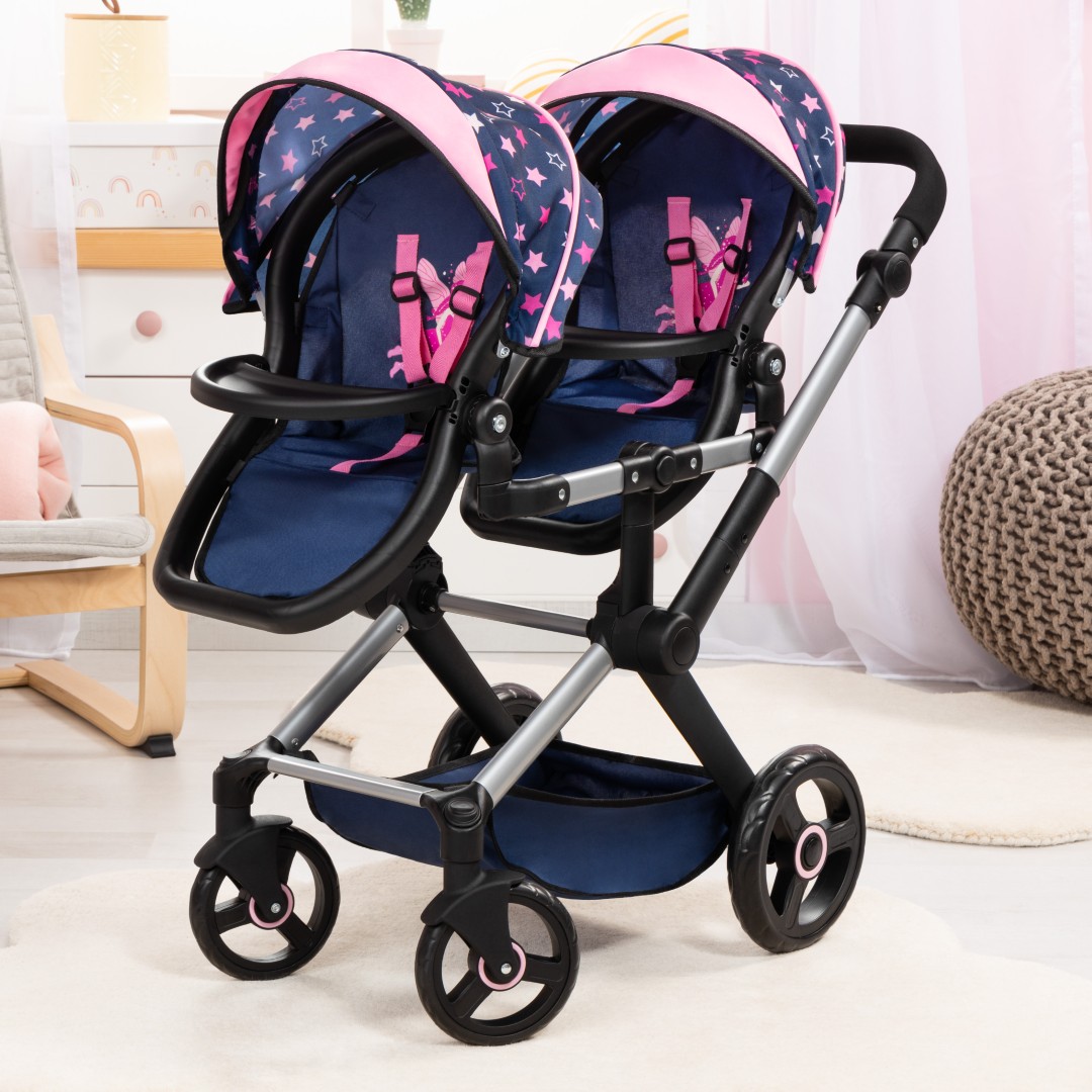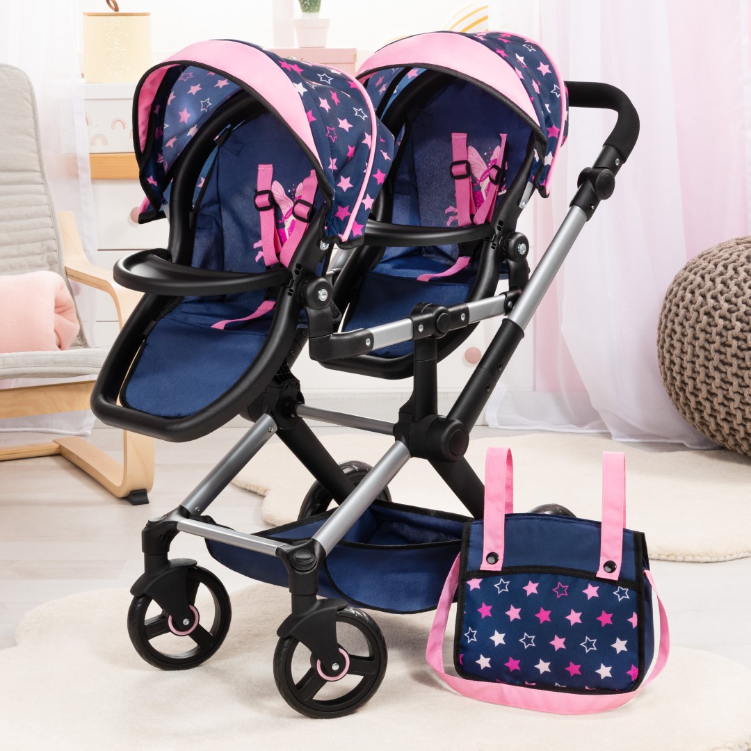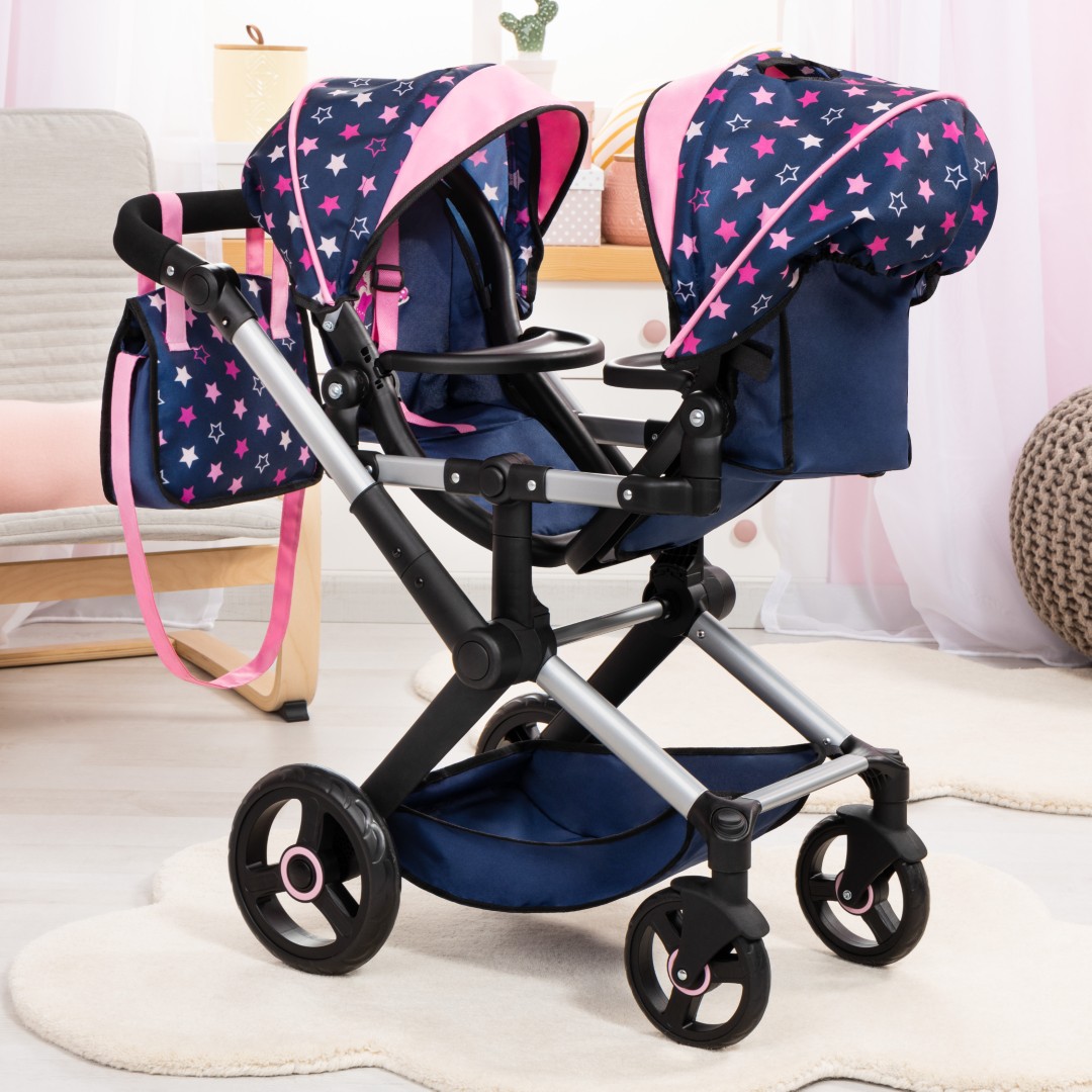 Tämä moderni kaksosten nukenrattaat sopii jopa 46 cm:n pituisille nukeille.