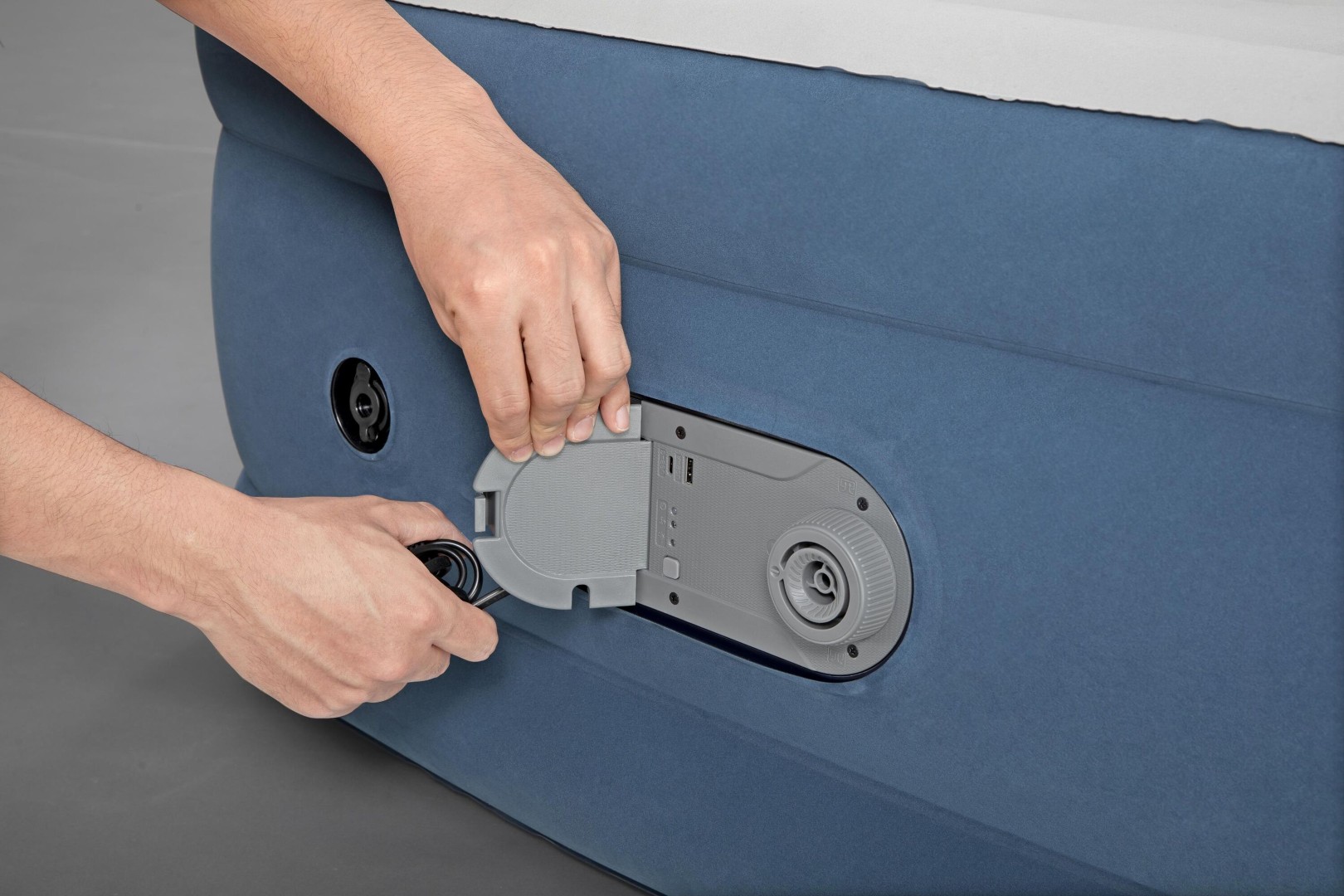 AlwayzAiren kaksoispumppu varmistaa, että ilmapatjasi pysyy täytettynä koko yön. Sisäiset anturit tarkkailevat ilmanpainetta, ja pumppu puhaltaa ilmapatjan äänettömästi uudelleen nukkuessasi, jotta se pysyy halutun kiinteänä. Kaksoispumppujärjestelmä täyttää ilmapatjan vain 3 minuutissa, mikä vähentää ilmahäviötä ja estää ylitäytön. Siinä on myös USB-portit älylaitteiden helppoa ja kätevää lataamista varten. Parhaiden tulosten saavuttamiseksi ilmapatjan on oltava kytkettynä verkkovirtaan koko yön. Ei virtaa, ei ongelmaa - tämä ilmapatja on yhteensopiva myös käsikäyttöisten pumppujen kanssa täyttöä varten, mutta sähkövirta tarvitaan, jotta kaksoispumppuanturit toimisivat kunnolla.