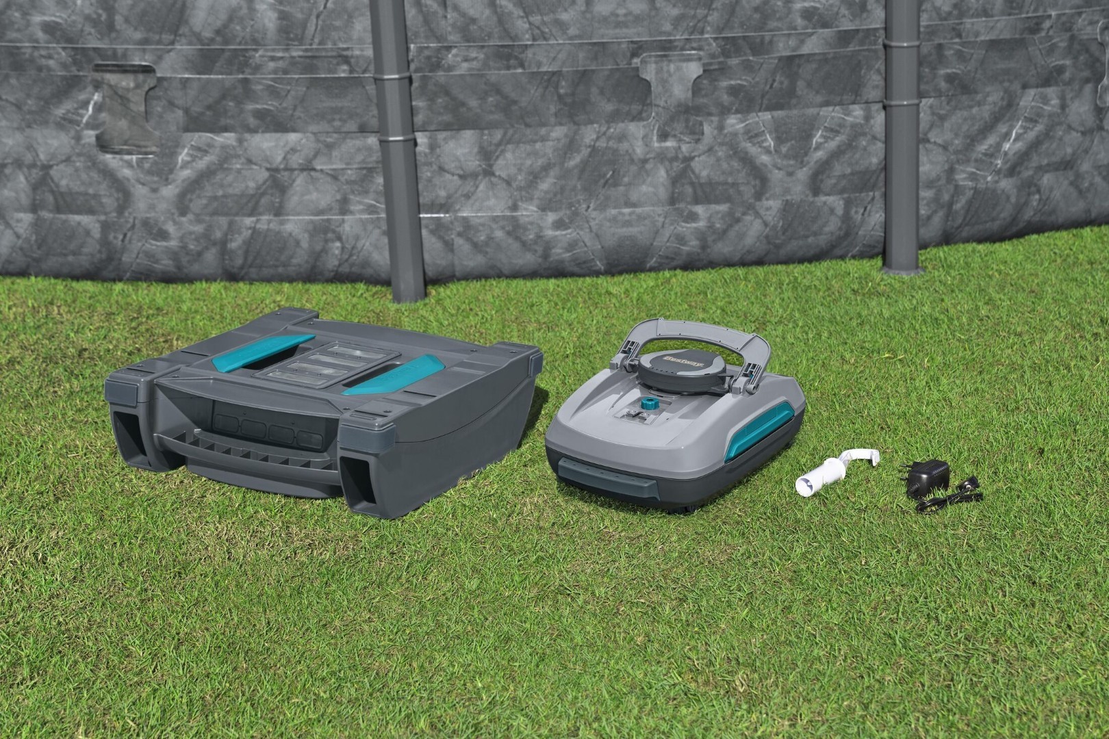 Bestway® AquaTronix™ Pro G300 -allasrobotti-imuri ja skimmeri on itsekulkeva altaanpuhdistusrobotti, joka pitää altaasi puhtaana. Itseliikkuva rakenne liikkuu altaan lattialla ja pinnalla itsestään. Valitse imurin tai skimmerin suutin, kiinnitä se robottiin ja aseta se veteen. Imurin jätelokeroon mahtuu jopa 3,5 litraa ja skimmeriin jopa 6 litraa jätettä ennen tyhjennystä, mikä on kaksi kertaa enemmän kuin useimmissa markkinoilla olevissa robotti-imureissa. Pikaklikkaussoljen ansiosta huolto ja puhdistus on lastenleikkiä - avaa vain lokero ja poista roskat. AquaTronix on varustettu ladattavalla akulla, ja se voi toimia jopa 2 tuntia, kun se on ladattu täyteen.AquaTronix on yhteensopiva maanpäällisten tasopohjaisten altaiden kanssa, joiden kokonaispinta-ala on enintään 50 m², ja se sopii parhaiten pyöreisiin altaisiin, joiden halkaisija on enintään 7,32 metriä, suorakulmaisiin altaisiin, joiden pituus on enintään 9,56 metriä, tai soikeisiin altaisiin, joiden pituus on enintään 7,92 metriä.