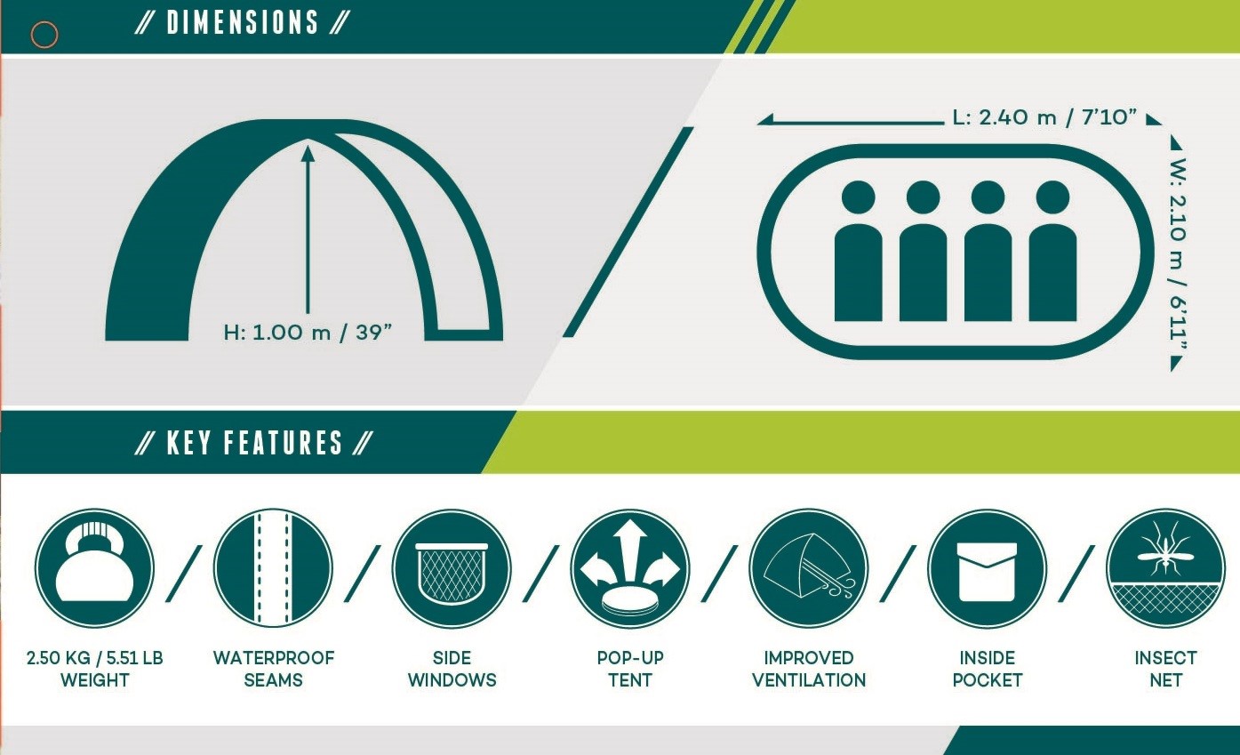 Bestway® Cool Mount 4 -teltta sopii täydellisesti luonnosta nauttimiseen päivällä ja yöllä. Kompakti koko sopii täydellisesti jopa 4 hengelle, olitpa sitten telttailemassa, festivaaleilla tai vain rentoutumassa rannalla. Cool Mount 4 -teltta on välttämätön lisävaruste takapihan tähtien katseluun tai viikonloppuretkille, ja se on tarpeeksi kompakti mahtuakseen suoraan auton tavaratilaan tai kiinnitettäväksi vaellusreppuun. Tämä käytännöllinen teltta on nopea ja helppo pystyttää, sillä se kestää vain 3 minuuttia, ja se sisältää maasuojakerroksen, joka suojaa telttaa kosteudelta, vedeltä ja muilta elementeiltä. Hengittävä verkkokangas on varustettu hyönteisverkolla, joka pitää hyönteiset loitolla ja päästää samalla viileän, raikkaan ilman puhaltamaan läpi. Verkon lisäksi yksikerrosrakenne, sisäänkäynti ja kaksi sivuikkunaa takaavat runsaan tuuletuksen päivällä ja yöllä. Ja sisäpuolella on tasku lisäsäilytystilaa varten! Bestway Cool Mount 4 -teltan mukana tulee oma kantolaukku, joten se on täydellinen ratkaisu kaikille liikkeellä oleville.