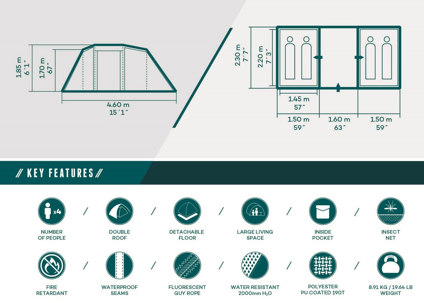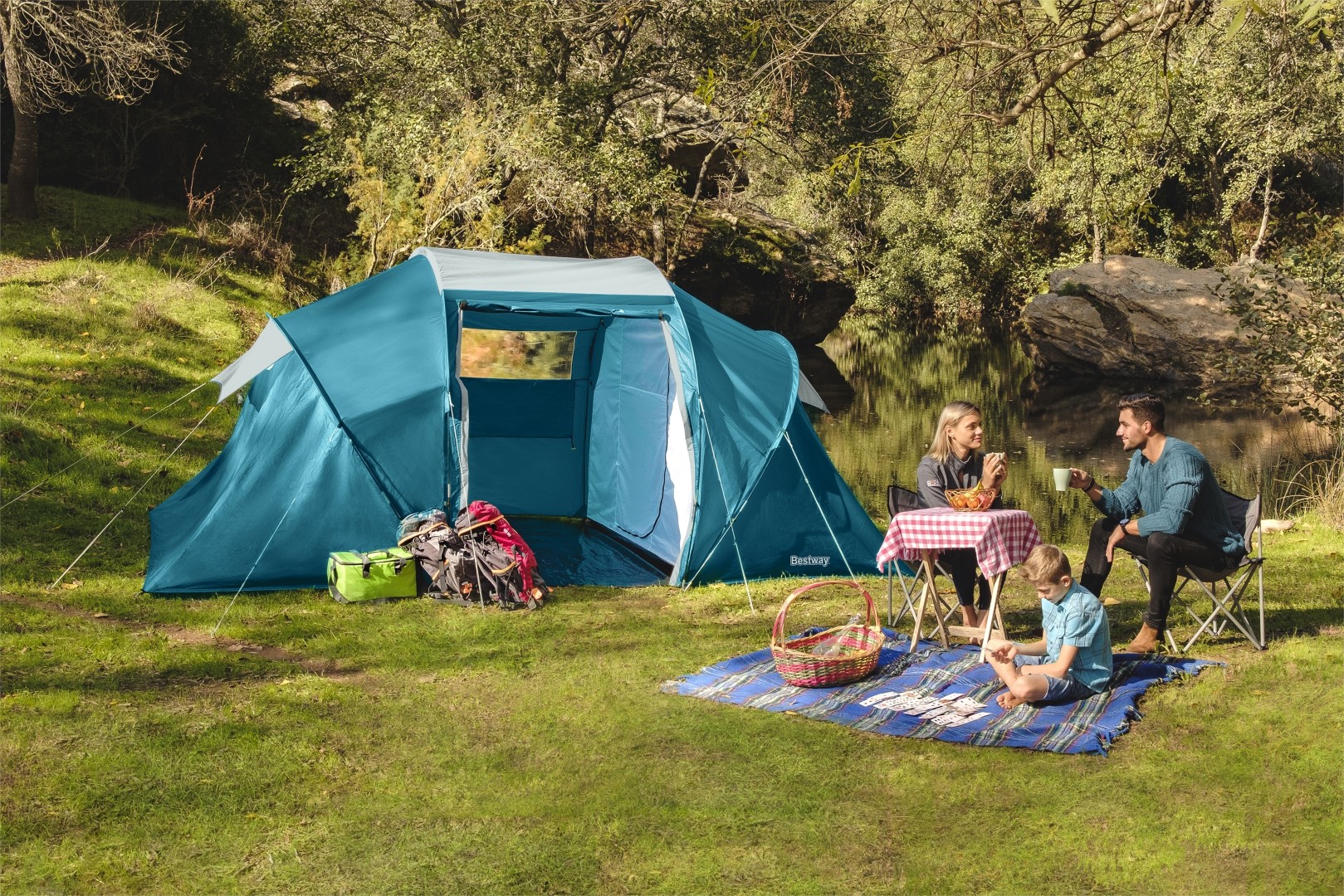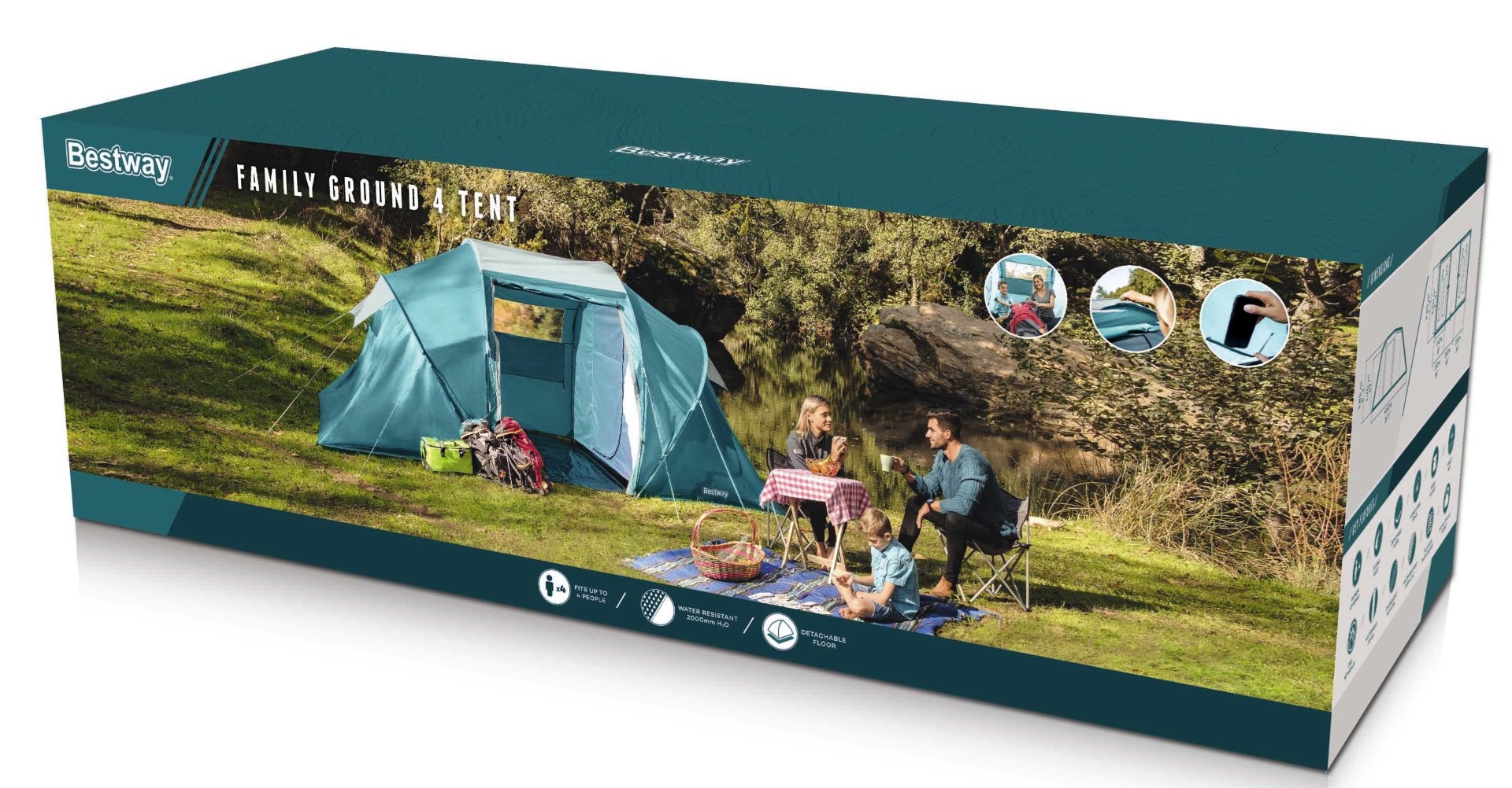 Lähde ulos ja tutki enemmän Bestway® Family Ground 4 -teltassa. Tämä perheteltta on täydellisen kokoinen 4 hengelle ja tarpeeksi kestävä kestämään retkeilyretkiä vuodesta toiseen. Teltassa on suuri oleskelutila keskellä ja makuutilat, jotka voidaan tarvittaessa jakaa kahdeksi huoneeksi. Palosuojattua kangasta ja vedenpitäviä saumoja sisältävä Family Ground 4 -teltta on täydellinen seuraavalle ulkoilureissullesi. Teltassa on 4 sisätaskua lisäsäilytystä varten, hyönteisverkko ja fluoresoivia kiinnitysköysiä, joten sinulla ja perheelläsi on kaikki, mitä tarvitsette hyviin yöuniin. Teltta on myös helppo pystyttää ja purkaa, joten voit viettää enemmän aikaa tähtien katseluun ja vaahtokarkkien paahtamiseen perheesi kanssa ja vähemmän aikaa leirintäalueen rakentamiseen. Tee seuraavasta ulkoiluseikkailustasi kodin tuntuinen Bestway Family Ground 4 -teltan avulla.