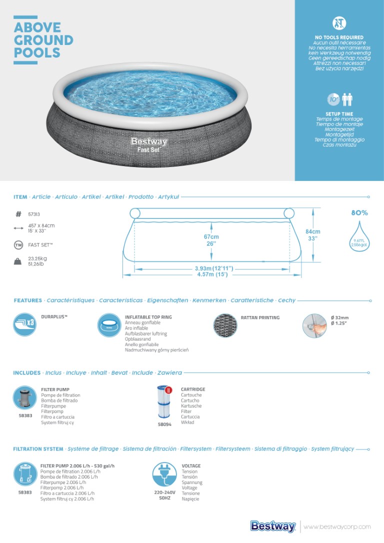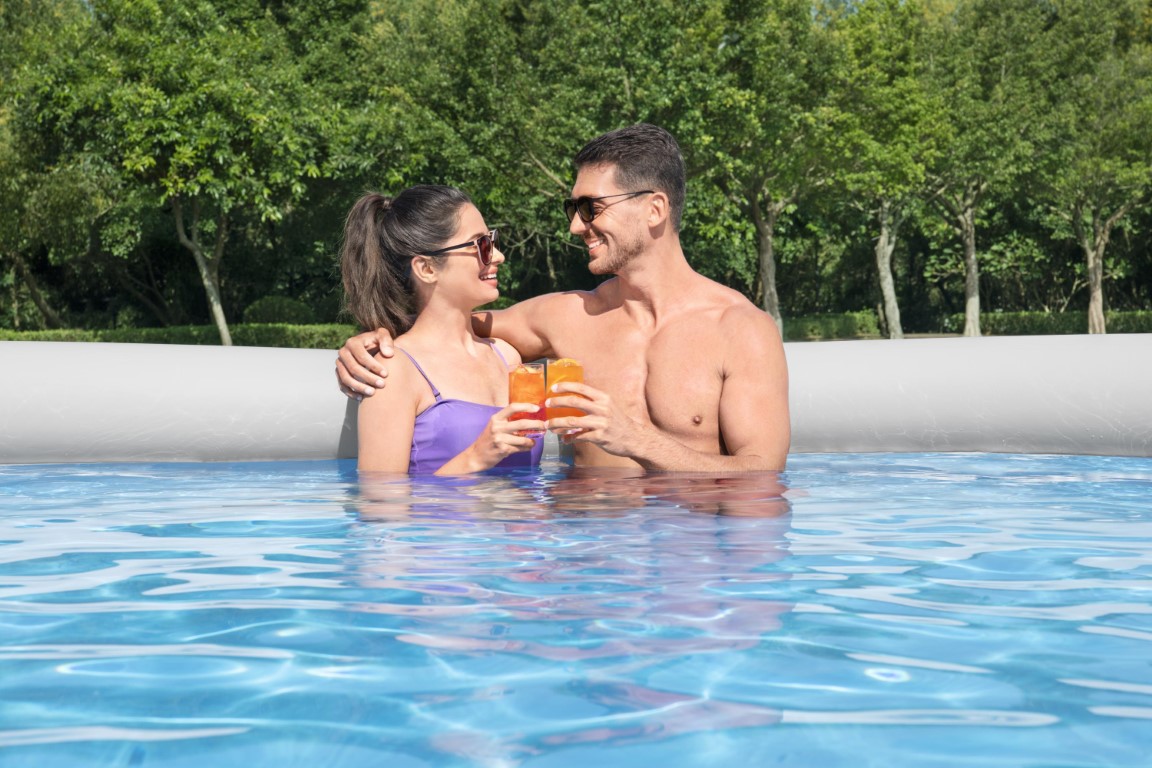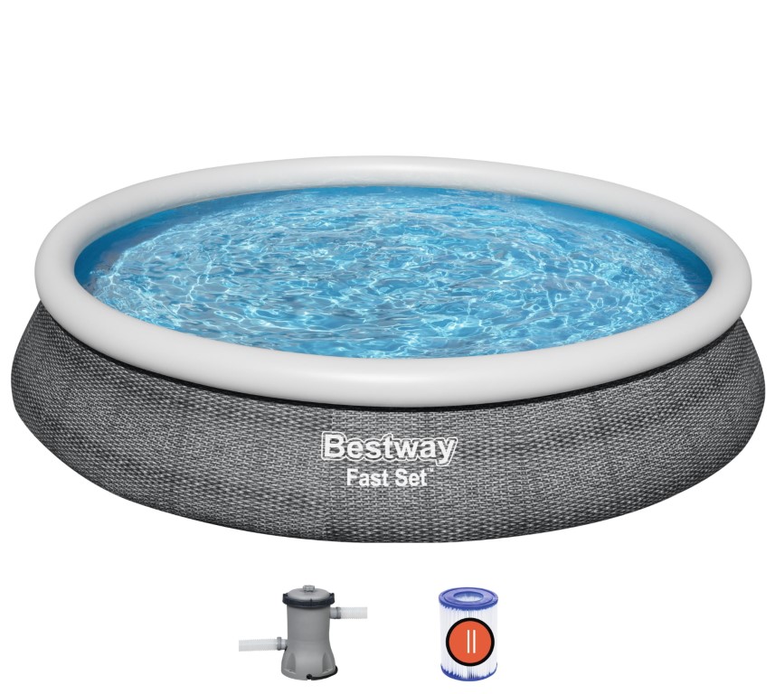 Tämän nopean ja helpon Bestway® Fast Set™ -allasasennussarjan avulla olet valmis allaspäivään hetkessä! Fill & Rise -asennusprosessi on yksinkertainen - valitse vain tasainen pinta, puhalla ylärengas ja allas nousee, kun se täyttyy vedellä. Tukeva DuraPlus™-vuori on valmistettu erittäin kestävästä 3-kerroksisesta materiaalista, joka on vahvistettu lujuuden vuoksi ja joka on 85 % PVC:tä läpilyöntikestävämpi. Viehättävässä vuoriliinassa on myös realistinen rottinkipainatus, joka tuo tyylikkään ilmeen ja tunnelman takapihallesi. Kun kausi on ohi, varastointi on nopeaa ja helppoa. Vesi poistuu helposti virtausta säätelevän tyhjennysventtiilin kautta, minkä jälkeen allas voidaan taittaa kokoon, jotta se voidaan säilyttää kompaktisti sesongin ulkopuolella. Settiin kuuluu myös suodatinpumppu, joka auttaa pitämään veden puhtaana. Tämä allas on ihanteellinen valinta perheille, jotka etsivät nopeaa ja helppoa allasvaihtoehtoa takapihalleen. Lapset nauttivat kesäpäivien roiskimisesta ja leikkimisestä vedessä, ja myös vanhemmat voivat nauttia mukavasta ja rentouttavasta uimisesta. Kausi ei ole täydellinen ilman Bestwayn kätevää Fast Set -allasta!