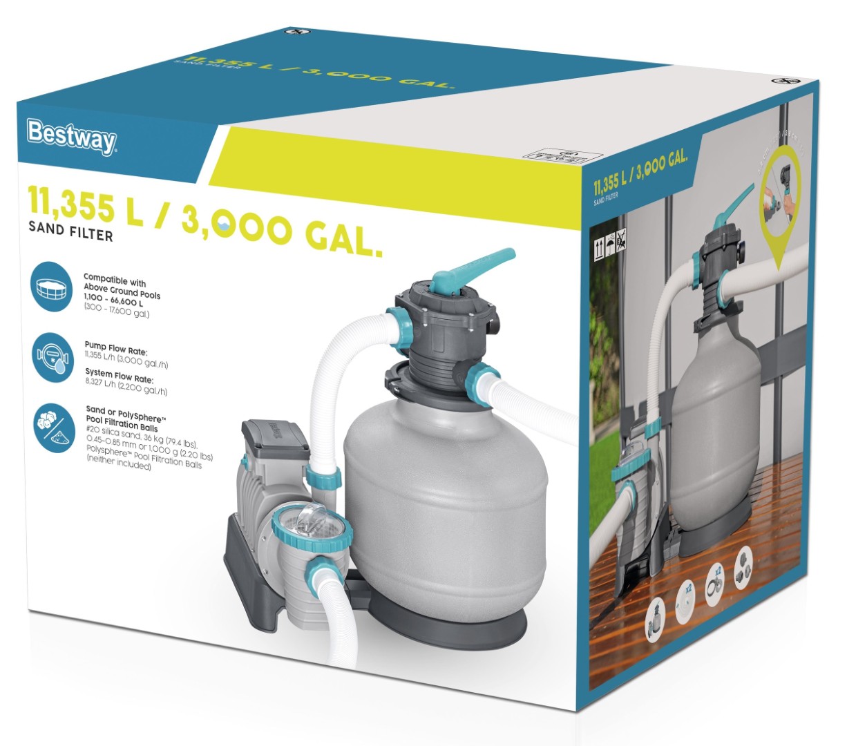 Pidä allasvesi kristallinkirkkaana ja puhtaana Bestway® 11,355 L hiekkasuodatinpumpun avulla! Tämä tehokas pumppu kestää kauemmin ja vaatii vähemmän huoltoa kuin perinteinen suodatinpumppu. Se käyttää joko kvartsihiekkaa tai Bestway Polysphere™ Pool Filtration Balls -suodatinpalloja (kumpikaan ei sisälly toimitukseen) suodattaakseen roskat pois altaasta, ja se sisältää esisuodatinkorin, joka pidättää isommat esineet ja lisää pumpun tehokkuutta ja käyttöikää. Kestävä, korroosionkestävä pumppu on esiasennettu, joten kytke se vain virtalähteeseen ja käynnistä se, niin altaasi suodatus paranee. Tämä hiekkasuodatinpumppu on yhteensopiva 1 100-66 600 litran altaiden kanssa. Siinä on myös 6-asentoinen kahva, joten voit helposti vaihtaa suodatustoiminnon suodattimen, suljetun, takaisinhuuhtelun, huuhtelun, tyhjennyksen ja kierron välillä. Tämä helppo, vähän huoltoa vaativa pumppu hoitaa likaisen työn, jotta voit keskittyä muistojen tekemiseen perheesi kanssa!