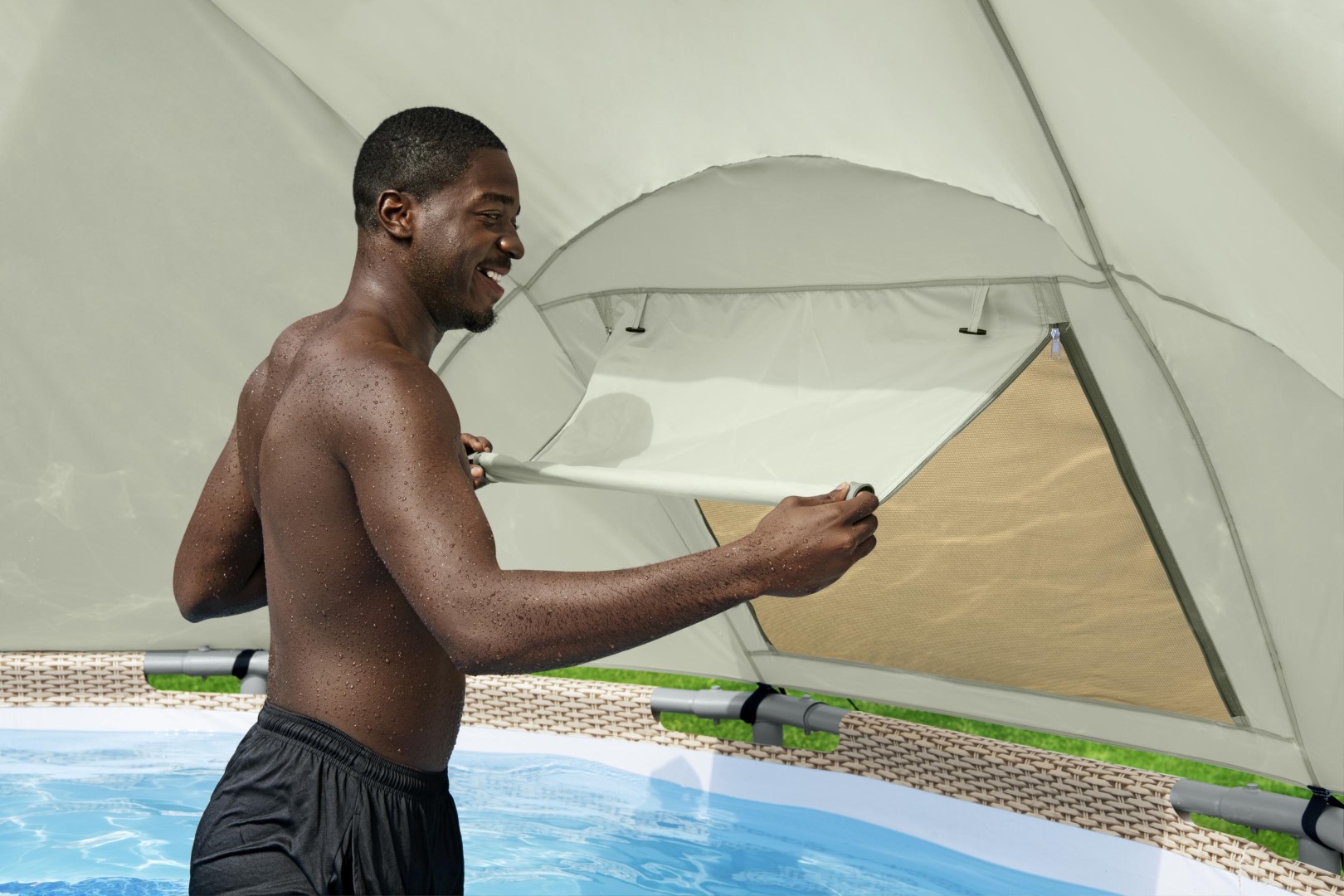 Nauti kesäpäivistä viilentyessäsi vedessä ja varjossa Bestway® Flowclear™ -allasvarjostimen avulla. Puoliavoimen muotoilun ansiosta voit nauttia altaastasi vapaasti niin paljon varjoa kuin haluat. Tämä yksikerroksinen katos voidaan helposti kiinnittää ja irrottaa minkä tahansa merkin maanpäällisen uima-altaan runkoon. Se on valmistettu sopimaan altaan runkoihin, joiden halkaisija on 3,05 m (10 ft.) - 5,49 m (18 ft.). Tässä aurinkovarjossa on myös verhot, jotka voidaan rullata ylös ja alas vetoketjun avulla, jolloin varjoa ja suojaa auringolta voidaan hallita täysin. Asennus on nopeaa ja helppoa, ja siihen kuluu vain noin 10 minuuttia. Allasvarjosarjaan kuuluu myös kätevä kuljetuslaukku, joka helpottaa kuljetusta ja säilytystä sesongin ulkopuolella. Pysy mukavan viileänä koko kesän Bestway Flowclear Pool Canopy -allasvarjostimen avulla!