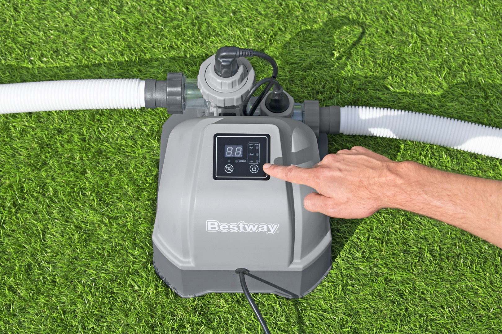 Järjestelmän ylläpito on helppoa, sillä siinä on automaattinen itsepuhdistustila. Aseta ajastin ja jatka päivääsi! Voit hallita järjestelmää nopeasti ja helposti kosketusnäyttöpaneelin avulla. Voit olla varma, että jos ongelmia ilmenee, sinua varoitetaan vihreällä/punaisella LED-valolla, ja voit ottaa yhteyttä Bestwayn asiakaspalvelun tukeen verkkosivuston kautta.