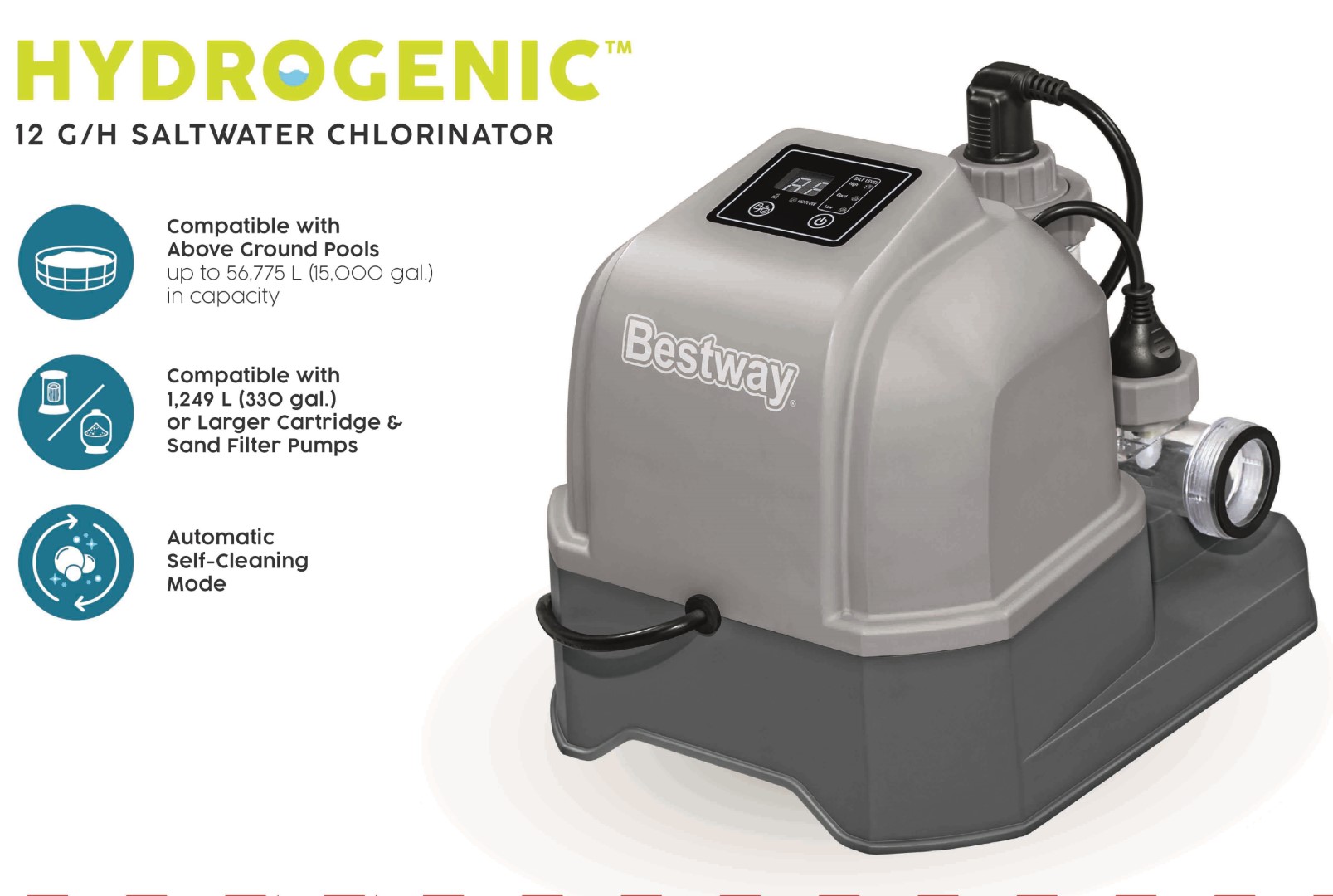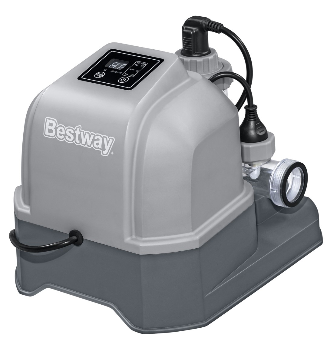 Bestway® Hydrogenic™ Suolaveden kloorauslaite on tehokas bakteereille altaassasi, mutta hellävarainen ihollesi. Innovatiivisen teknologian avulla Hydrogenic Saltwater Chlorinator muuntaa suolan pieneksi määräksi bakteereja tappavaa klooria, joka pitää altaasi kristallinkirkkaana ja puhtaana ja on samalla hellävarainen silmillesi, hiuksillesi, ihollesi ja uimapuvullesi. Toinen etu? Lisäämättä suoraan klooria altaaseen, voit nauttia perinteisen suolavesialtaan lähes hajuttomasta kokemuksesta! Ihanteellinen altaisiin, joiden vesitilavuus on enintään 56 775 litraa (15 000 gal.) ja suodatinpumpun virtausnopeus vähintään 1249 litraa (330 gal.). Lisää vain suola, ja järjestelmä tuottaa 12 grammaa klooria tunnissa, jolloin suolaveden ja kloorin suhde on täydellinen. Suolaveden kloorauslaite sisältää myös 50 3-in-1-testiliuskaa ja 25 suolaveden testiliuskaa, jotta voit aina mitata allasvesi kemiallisen ja suolaisen tasapainon ja pitää sen turvallisena ja puhtaana.