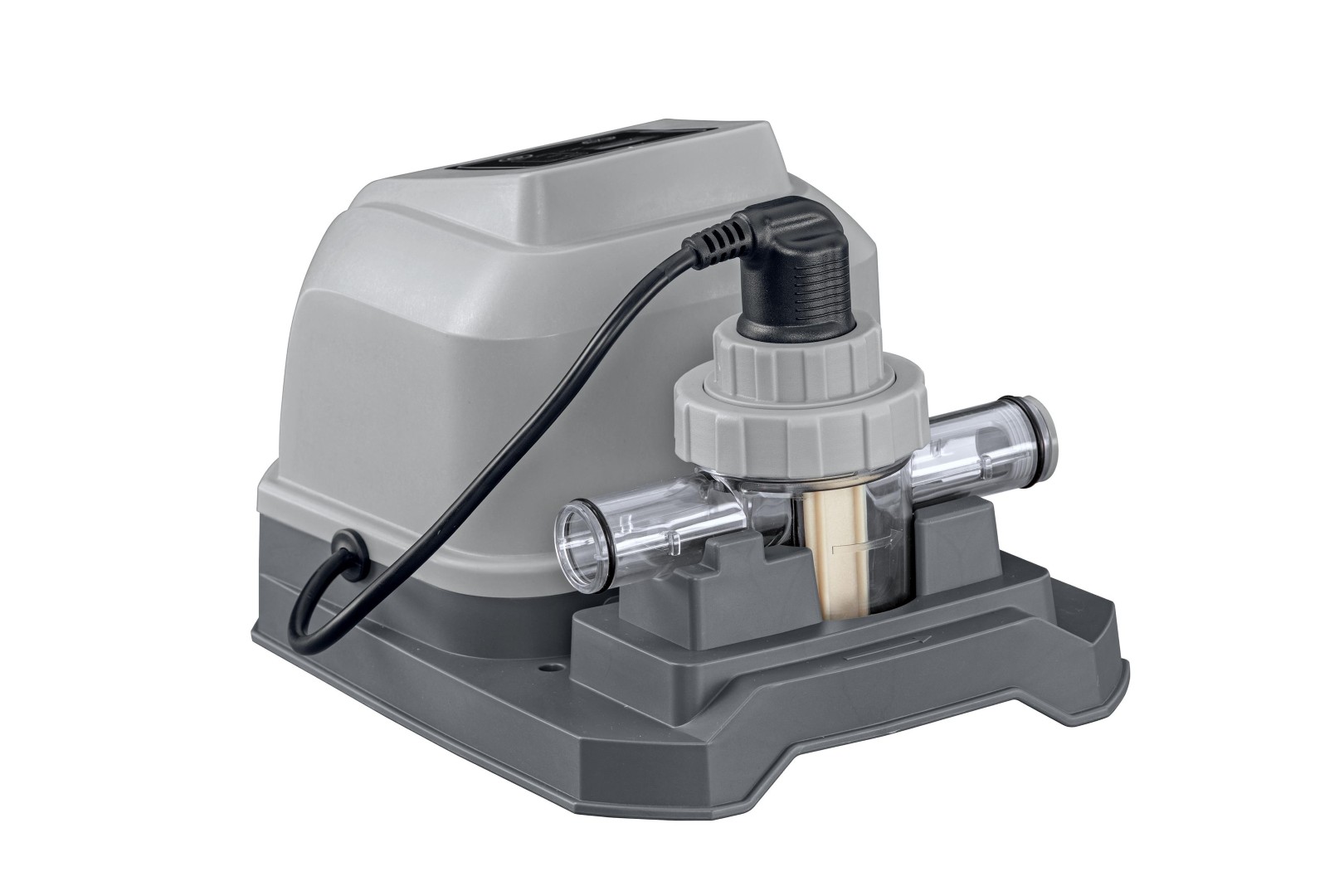 Bestway® Hydrogenic™ Suolaveden kloorauslaite on kova bakteereille altaassasi, mutta hellävarainen ihollesi. Innovatiivisen teknologian avulla suolaveden kloorinpoistolaite muuntaa suolan pieneksi määräksi bakteereja tappavaa klooria, joka pitää altaasi kristallinkirkkaana ja puhtaana ja on samalla hellävarainen silmille, hiuksille, iholle ja uimapuvuille. Toinen etu? Ilman suoraa kloorin lisäystä voit nauttia perinteisen suolavesialtaan lähes hajuttomasta kokemuksesta! Ihanteellinen altaisiin, joiden vesitilavuus on enintään 8 327 litraa ja suodatinpumpun virtausnopeus vähintään 1 249 litraa. Lisää vain suola veteen, ja järjestelmä tuottaa 2 grammaa klooria tunnissa, jolloin saavutetaan täydellinen suolaveden ja kloorin suhde. Lisäksi suolaveden kloorauslaite sisältää 50 3-in-1-testiliuskaa ja 25 suolaveden testiliuskaa, joten voit aina mitata allasvesi kemiallisen ja suolaisen tasapainon, jotta se pysyy turvallisena ja puhtaana.