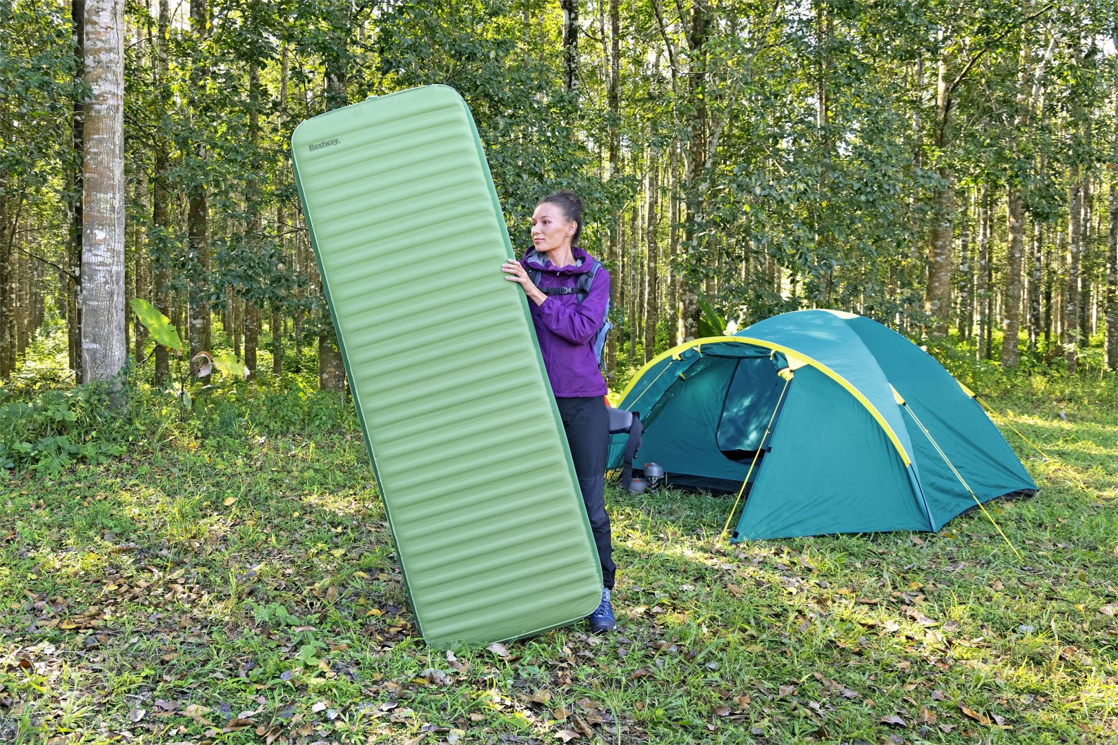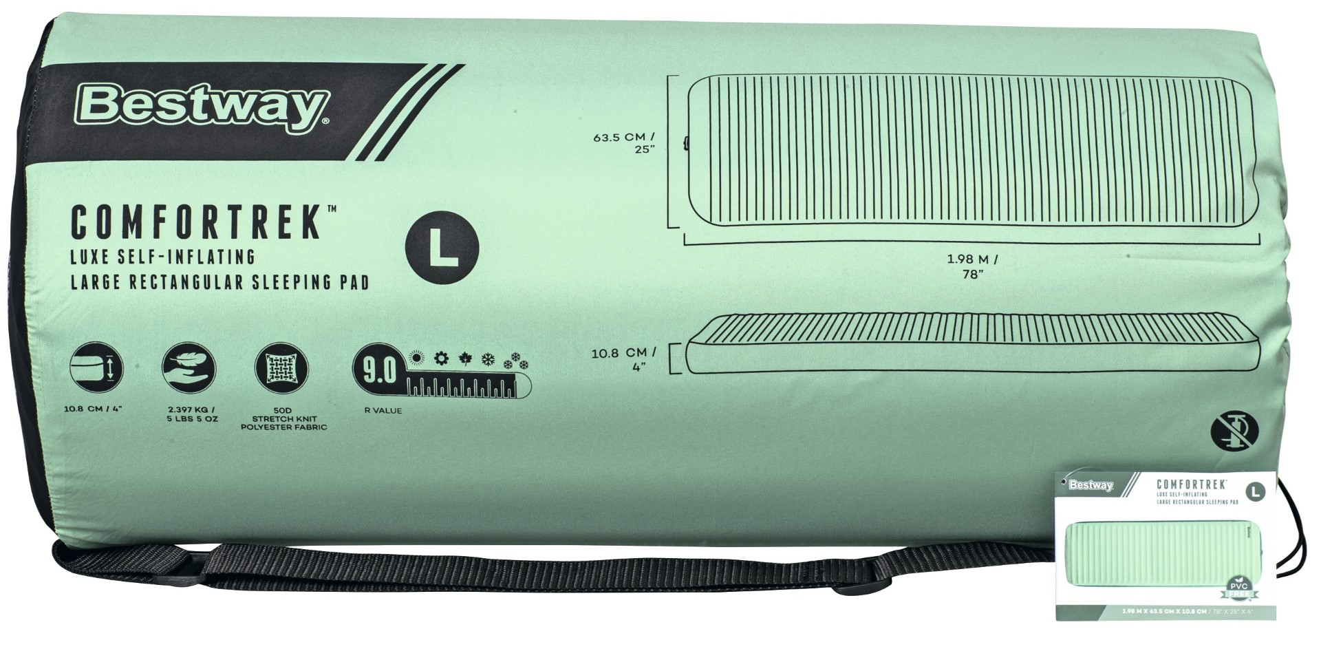 Bestway® ComforTrek™ Luxe Self-Inflating Large Rectangular Sleeping Pad -makuualustan avulla saat mukavat yöunet myös silloin, kun seikkailet takamaastossa. Itsestään täyttyvän rakenteen ja mukavan vaahtomuovisydämen ansiosta pysyt yöllä lämpimänä ja nautit samalla lisäpituudesta, pehmusteesta ja tuesta, kun käytät tätä ilmatyynyä makuupussisi alla (ei sisälly toimitukseen).