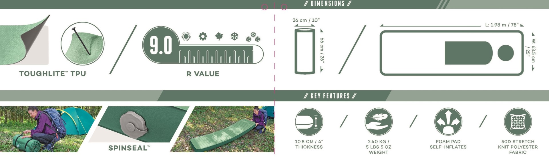 Jätä ylimääräiset lisävarusteet väliin ja nauti vaivattomasta puhalluksesta tämän innovatiivisen vaahtomuovisen ilmatyynyn avulla. Kierrä vain eksklusiivisen SpinSeal™-venttiilin sisäistä sulkua, jolloin ilmatyyny puhaltaa itse itsensä täyteen ja laajenee 10,8 cm:n paksuiseksi.