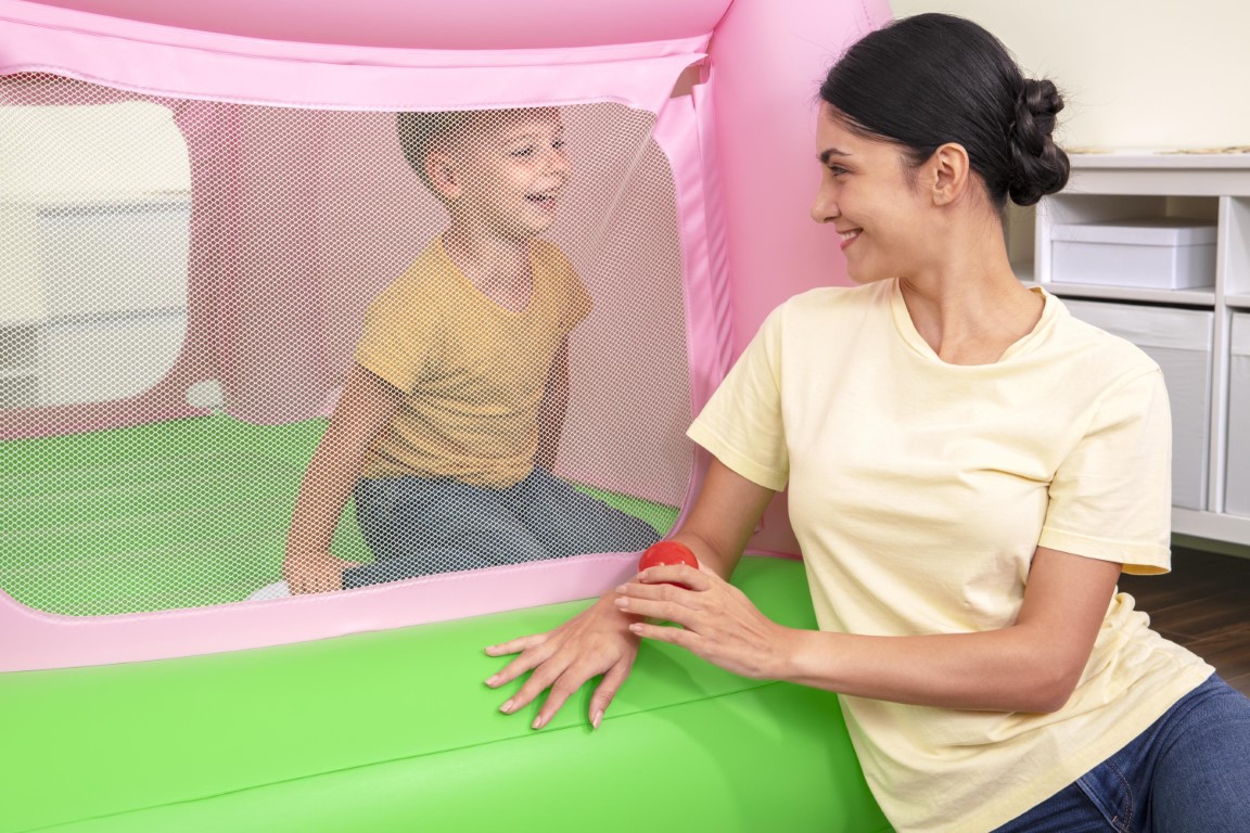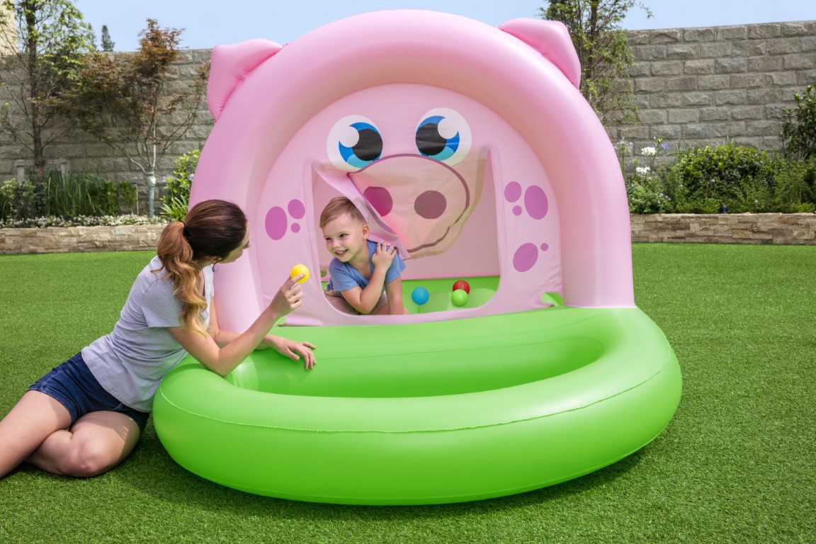 Kaksinkertaista hauskuutta ja leikki ympäri vuoden Bestway® Oinkster Pig™ pomppulinna^lla ja palloaltaalla! Tässä yhdistelmässä on kaksi hauskaa aktiviteettialuetta; pomppimisalue ja palloallas, jotka viihdyttävät lapsia tuntikausia. Mukana tulee myös 15 palloa, joilla he voivat leikkiä, mikä auttaa kehittämään silmä-käsi-koordinaatiota ja motorisia taitoja! Palloiluallasta voidaan käyttää koko vuodenajan, vedellä tai leikkipalloilla.