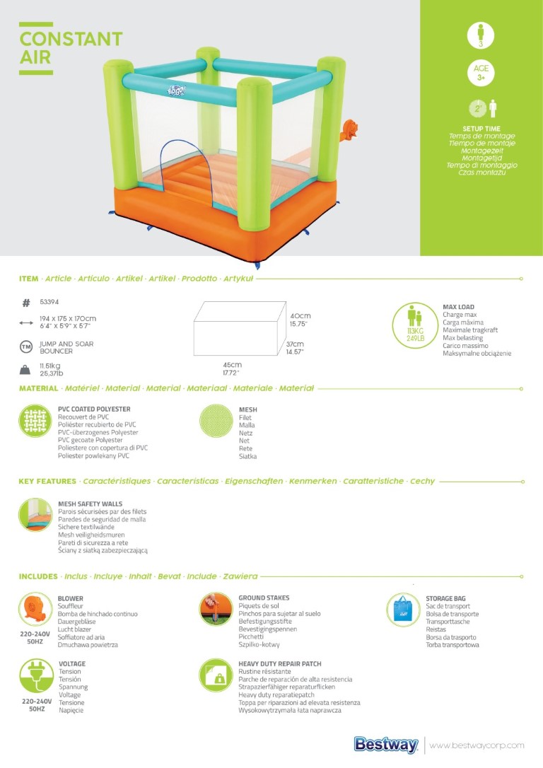 Mukana tuleva puhallin täyttää pomppulinnan muutamassa minuutissa, säästäen vanhempien aikaa ja vaivannäköä! Tämä helppokäyttöinen pomppulinna sisältää myös monia turvallisuusominaisuuksia, joista vanhemmat pitävät. Verkkoseinät pitävät lapset turvassa samalla, kun vanhemmat voivat pitää silmällä heitä koko ajan. Yksi sisään- ja uloskäynti mahdollistaa sen, että vanhemmat voivat seurata, kuka on pomppulinnassa, ja lapset voivat oppia urheiluhenkeä leikkiessään. Tätä pomppulinnaa voi käyttää sisällä tai ulkona, joten lapset voivat leikkiä ja tutkia turvallisesti. Pomppiessaan he kehittävät karkeamotoriikkaansa, stimuloivat mielikuvitustaan ja kasvattavat itseluottamustaan ja vuorovaikutustaitojaan. He nauttivat niin paljon, etteivät edes huomaa oppivansa! Jump and Soar Bouncer on täydellinen vuoden ympäri käytettävä lelu, joka tarjoaa tuntikausien hauskanpitoa.