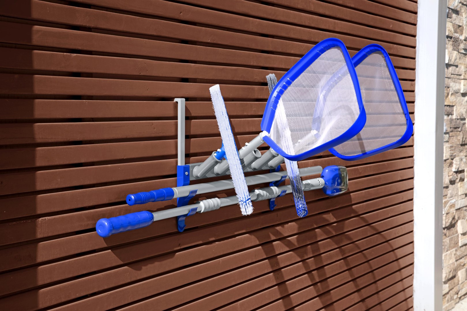 - Säilyttää jopa 2 tankoa ja 5 skimmeriä, harjaa, haravaa tai pölynimuria, joiden halkaisija on 3 cm / 1,2".