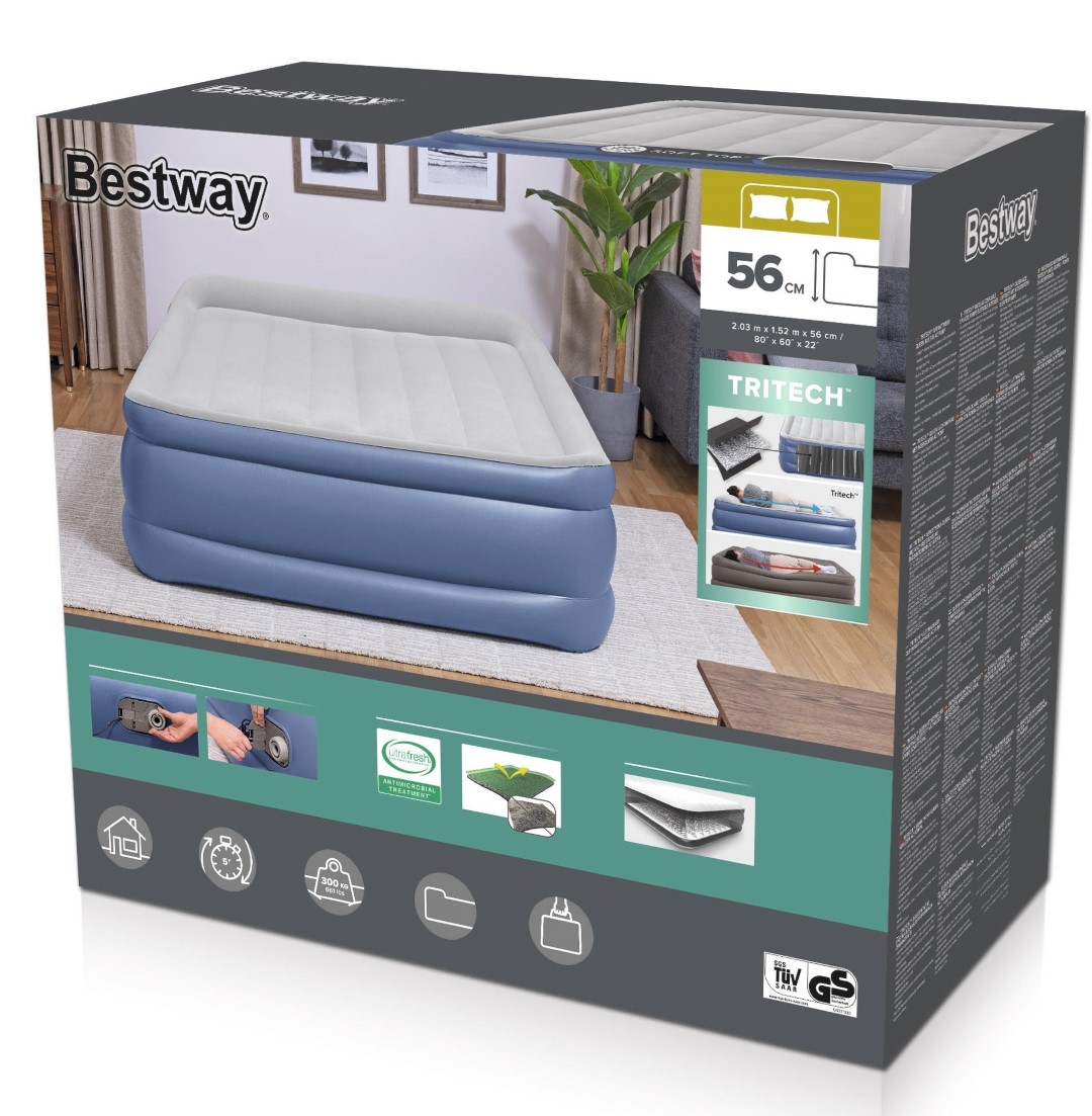 Herää uudistuneena ja virkistyneenä Bestway® Tritech™ -ilmapatjalla! Tämä queen-kokoinen sänky lupaa lujuutta, kestävyyttä ja mukavuutta koko yön. Sen kompaktin koon ja sisäänrakennetun pumpun ansiosta sitä on nopea ja kätevä käyttää aina tarvittaessa. Ja Ultra-Fresh™-antimikrobikäsittelyn ansiosta sänkysi on suojattu hajuja aiheuttavien bakteerien, homeen ja homeen kasvua vastaan pinnalla.