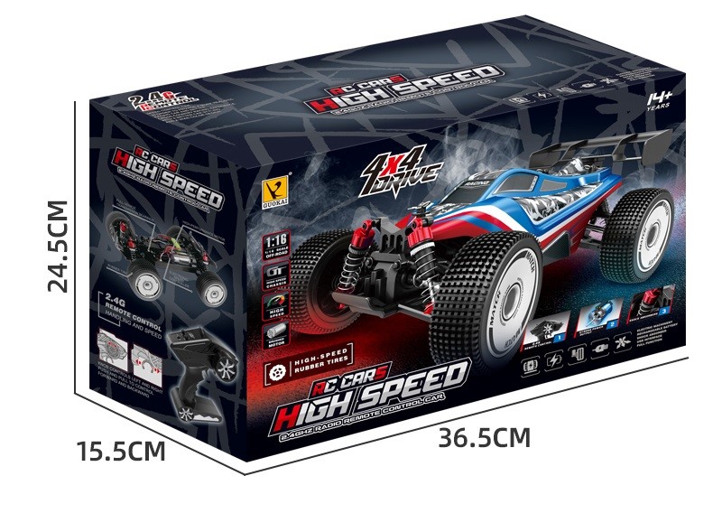 Guokai Off-Road Buggy 1:16 ei ole pelkkä kauko-ohjattava auto; se on kutsu jännittäviin maastoseikkailuihin. Tutki kukkuloita, mutkia ja haastavaa maastoa tällä buggyllä, joka on rakennettu toimimaan.
