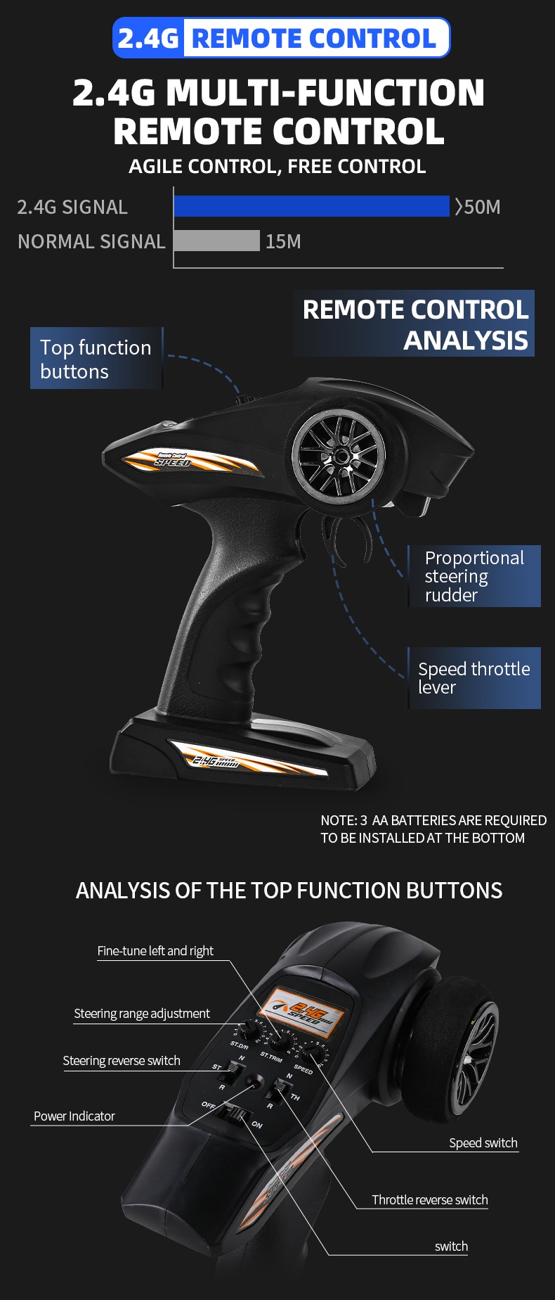 • Edistyksellinen 2.4G-kaukosäädin, jossa huippunopeus jne. voidaan asettaa.