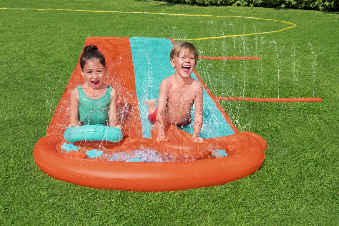Taistele tylsyyttä vastaan tänä kesänä Bestway® Sponge Soakers™ Double Slide -liukumäellä. Nappaa ilmatäytteiset kilvet, jotka toimivat myös boogie-lautoina, ja hurauta alas liukumäkeä. Roiskahda värikkäillä Sponge Soakers -liukumäillä täytettyyn vesialtaaseen ja nauti pehmeästä sivukeitaasta. Kun olet laskenut liukumäkeä alas, valmistaudu hauskaan vesitaisteluun, jossa sinun on väisteltävä pehmeitä pesusieniä. Lapset nauttivat hauskasta vesitaistelusta ja vanhemmat vaivattomasta siivoamisesta. Poimi värikkäitä sieniä ja heitä niitä ystäviisi! Sponge Soakers on suunniteltu imemään vettä ja tekemään ison roiskeen jokaisella heitolla. Hyppää ulos roiskeläpistä ja juokse sivussa olevien 2 bonussprinklerin läpi ja nauti virkistävästä roiskeesta. Yhdistettynä SplashBoost™-ruiskutustekniikkaamme, joka on rakennettu tarjoamaan kohdennettua veden peittävyyttä liukumisen ja roiskumisen optimoimiseksi, tässä liukumäessä on kaikki ominaisuudet kesän täynnä hauskanpitoa varten! Järjestä täydelliset takapihajuhlat ja kokoa joukkueet kattotynnyreitä, väistöliikkeitä ja liukumäkiä varten! Sponge Soakers -tuplaliukumäki on kauden lelu - helppo pystyttää ja purkaa, uudelleenkäytettävissä ja valtavan hauska.
