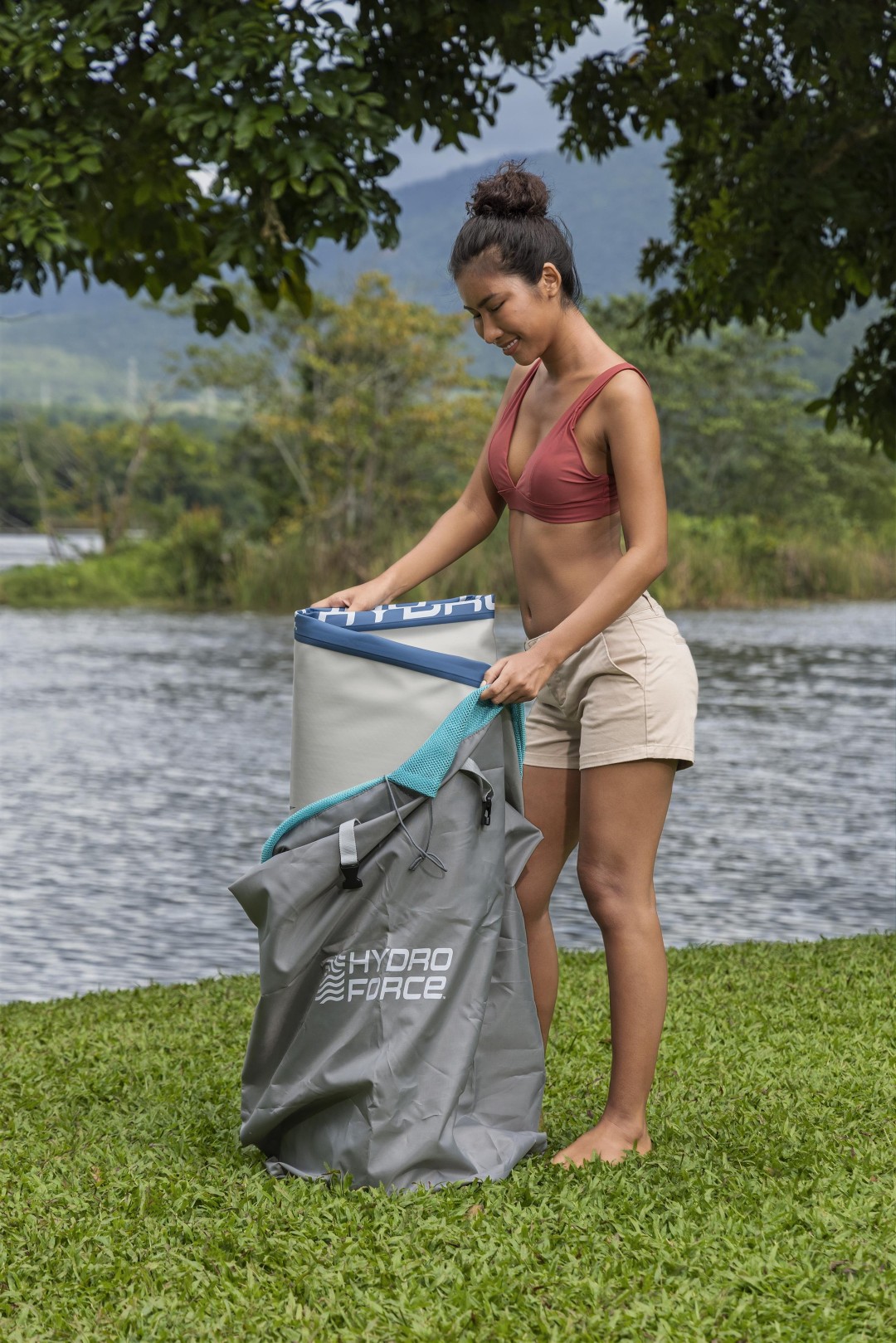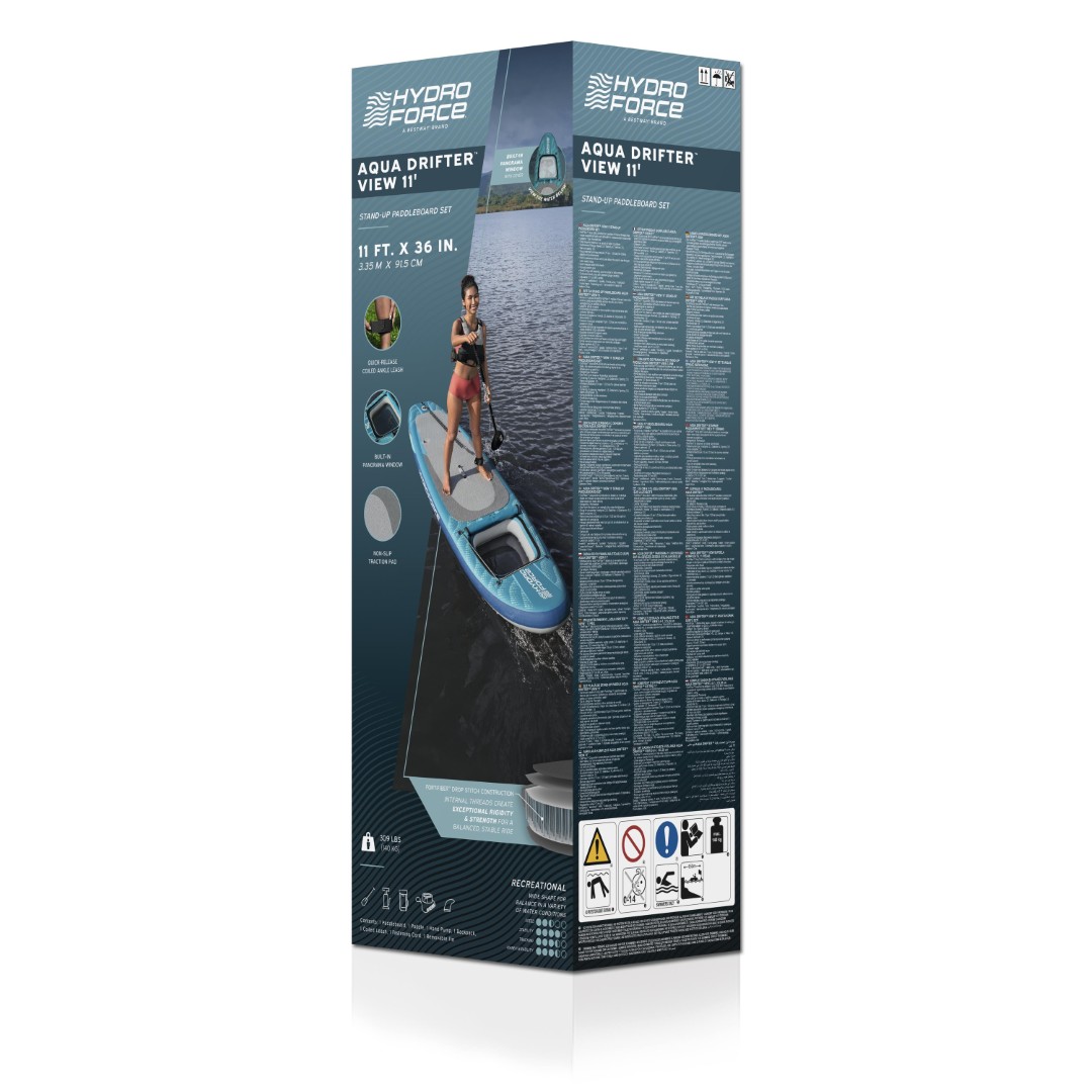 Tuo uusi näkökulma kaikkiin vesiseikkailuihisi Hydro Force® Aqua Drifter™ View 3.35 Inflatable Stand-Up Paddleboard -paketin avulla! Tässä virkistyskäyttöön tarkoitetussa monitoimilaudassa on leveä muoto, joka parantaa tasapainoa vaihtelevissa vesiolosuhteissa, sekä sisäänrakennettu ikkuna, joka tarjoaa ainutlaatuisen vesikokemuksen. Voit katsella suoraan veden alle ja ihailla kaloja ja muita vesieläimiä, kun ne uivat ohitsesi! Kun haluat estää veden roiskeet tai auringon häikäisyn pidemmillä matkoilla, mukana tuleva suojus kiinnittyy helposti ja turvallisesti ikkunan päälle.