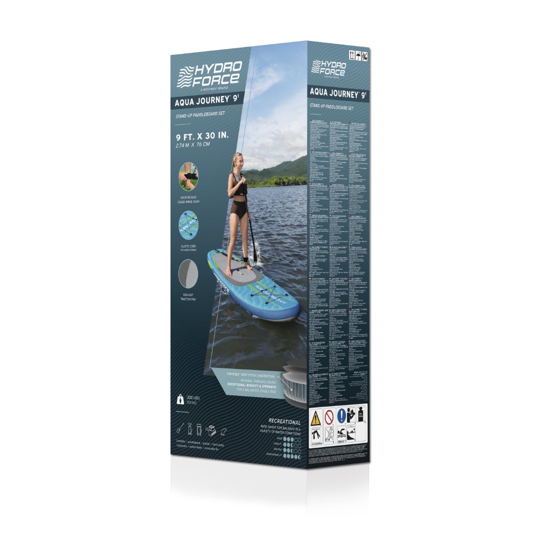 Hydro Force® Aqua Journey™ 2,74 m puhallettava Stand-Up Paddleboard Kit on valmis kaikkiin vesiseikkailuihin! Tässä vapaa-ajan monitoimilaudassa on leveä muoto tasapainon saavuttamiseksi erilaisissa vesiolosuhteissa, ja värikäs muotoilu saa sinut varmasti erottumaan vesillä.