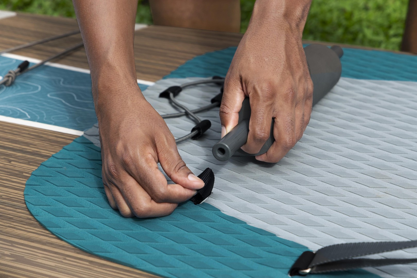 Tämän laudan parhaita puolia on sen muunneltavuus. Eikö huvita seistä ja meloa? Kiinnitä vain mukana tuleva jalkatuki ja selkänojallinen istuin – ja SUP muuttuu hetkessä kajakiksi. Laudassa on runsaasti säilytysmahdollisuuksia henkilökohtaisille tavaroille: sisäänrakennettu vesipulloteline, jossa on säädettävä kuminauha erikokoisille pulloille, joustavat narut sekä edessä että takana tavaroiden kiinnittämistä varten, sekä D-renkaita ja kiinnitysnaru takana esimerkiksi kylmälaukkua varten. Kolme irrotettavaa evää parantavat laudan kulkua vedessä, ja liukumaton timanttikuvioinen jalkatyyny auttaa säilyttämään tasapainon. Potkutyyny tuo lisäketteryyttä. Nopea, irrotettava hihna voidaan kiinnittää nilkkaan tai vyötärölle oman mukavuuden mukaan. Kun haluat irrottaa hihnan, se käy helposti vetämällä pikavapautuskielekkeestä.
