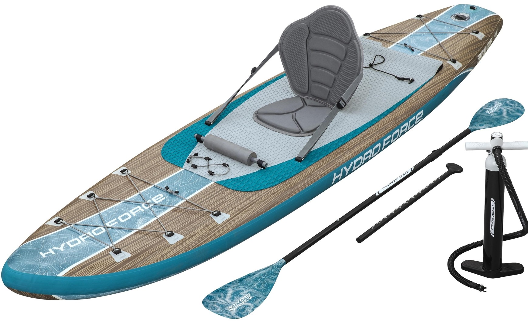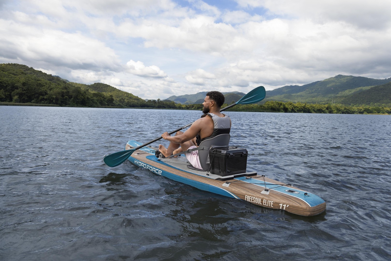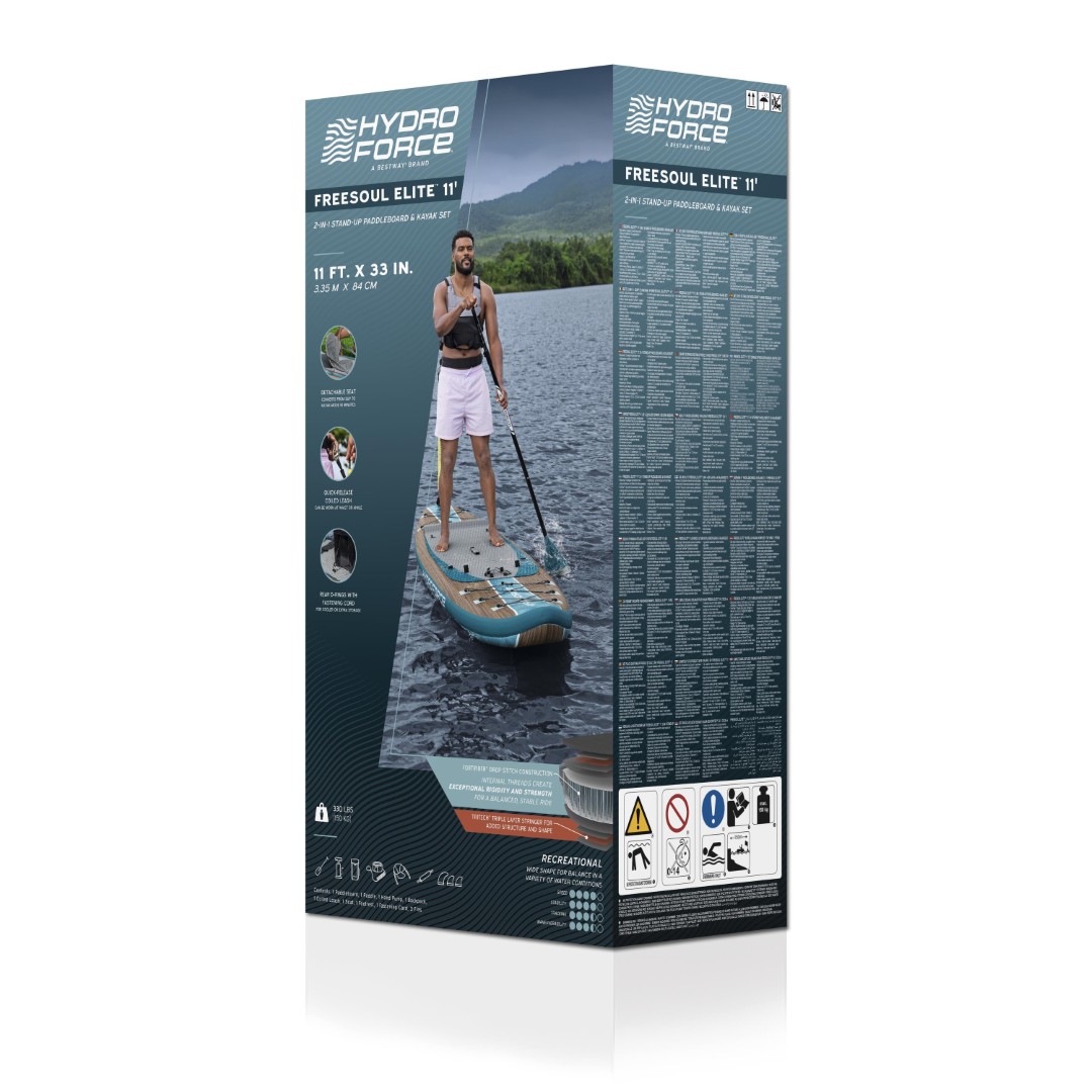 Lähde vesille ja anna seikkailun täyttää sielusi Hydro Force® Freesoul Elite™ 2-in-1 -puhallettavan Stand-Up Paddleboard- ja kajakkipaketin avulla! Tässä monipuolisessa vapaa-ajan laudassa on leveä muotoilu, joka tarjoaa erinomaista tasapainoa vaihtelevissa vesiolosuhteissa, ja sen kokonaiskantavuus on jopa 150 kg. Se on suunniteltu nautinnolliseen melontaan tai rentouttavaan vesillä liikkumiseen – taitotasosta riippumatta.