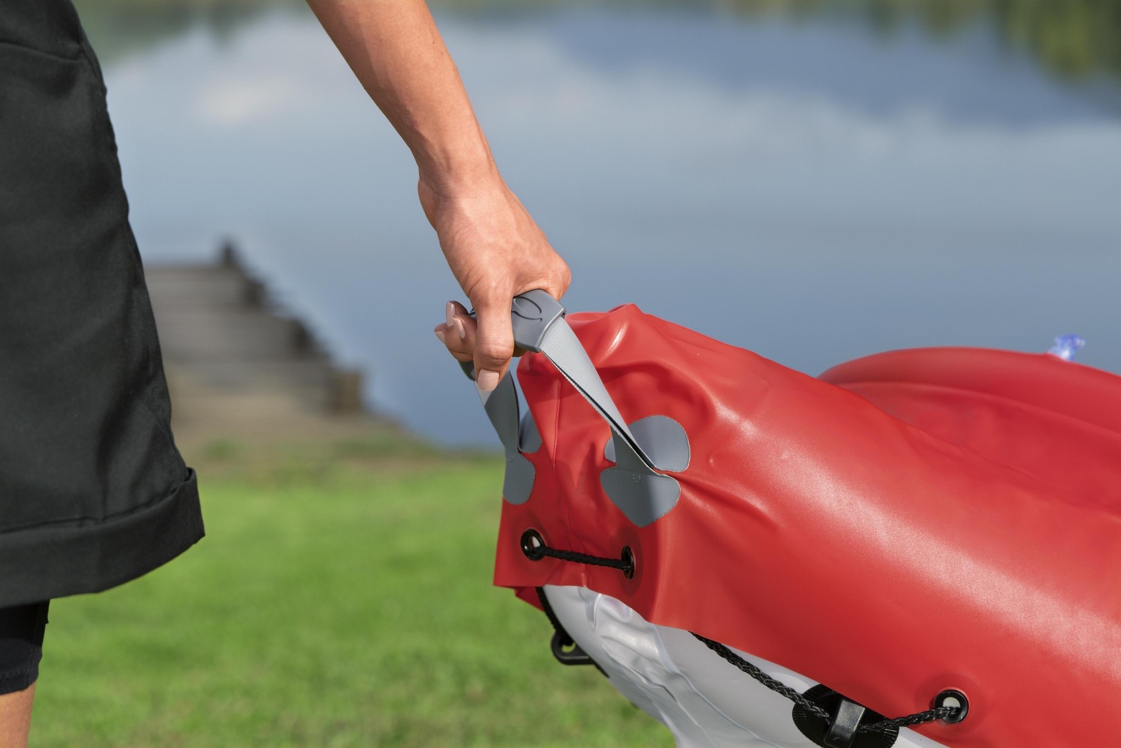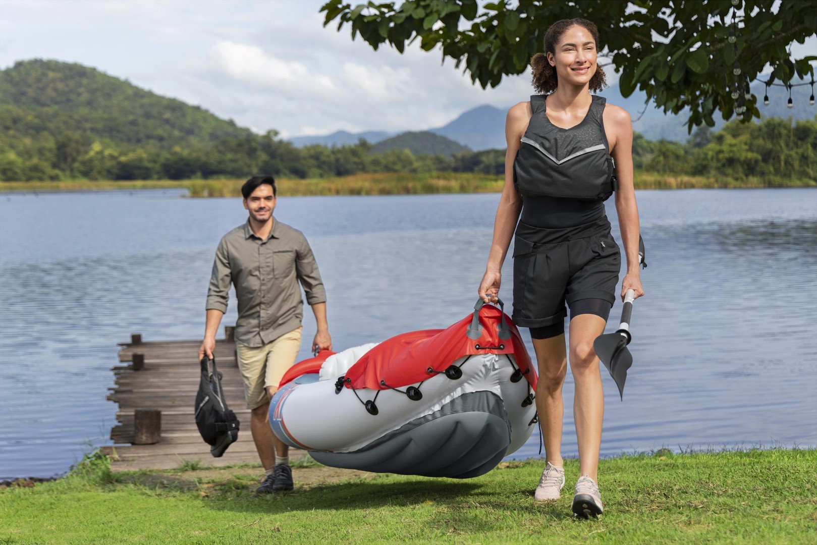 Hydro Force® Rapid™ X1 -kajakkipakkaus on jokaisen ulkoiluharrastajan pakollinen varuste. Tämä tilava kajakki sopii täydellisesti yhdelle aikuiselle, jonka kokonaispainokapasiteetti on 120 kg, ja se täyttyy ja tyhjenee helposti ja pakkautuu pieneen kokoon, joten sen voi ottaa mukaan mihin tahansa seikkailuun. Tämä kajakki on valmistettu Inflata-Shield™-materiaalistamme, joka on suunniteltu kestämään puhkeamisia ja rajoittamaan venymistä vakauden ja ilman pysyvyyden vuoksi, ja se sopii erinomaisesti käytettäväksi puroilla, pienillä joilla, järvillä ja muualla. Ohjaamossa on säädettävä puhallettava istuin, jossa on pehmustettu selkänoja, joten voit istua mukavasti pitkillä matkoilla. Lisäksi kaksi erikokoista irrotettavaa evää mahdollistavat suunnanmuutoksen eri vesiolosuhteissa. Muotoileva rakenne estää vettä pääsemästä ohjaamoon ja kastelemasta sinua tai varusteitasi, mutta tekee myös sisään- ja ulospääsemisestä helppoa. Kahden raskaan kantokahvan ansiosta kajakin kuljettaminen veteen ja vedestä pois on vaivatonta. Rapid X1 -pakkaus sisältää myös säilytyslaukun kajakille, melan, pumpun ja evät, joten voit matkustaa minne haluat.