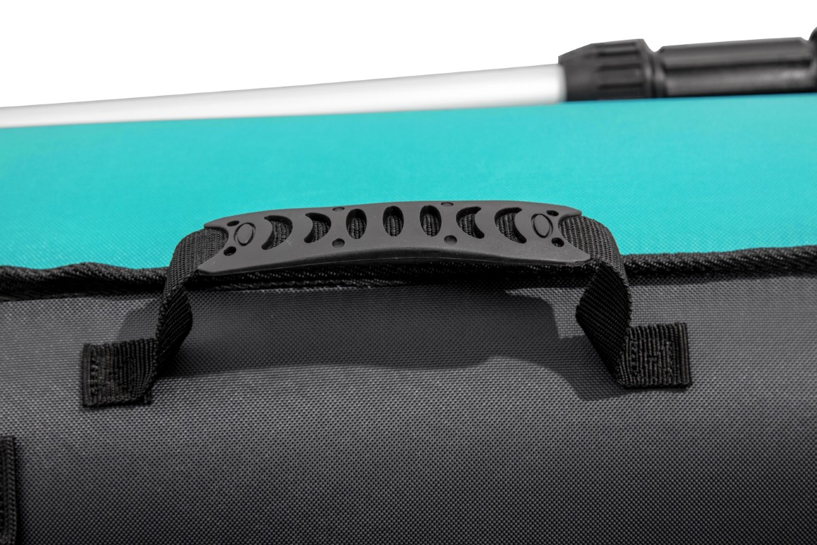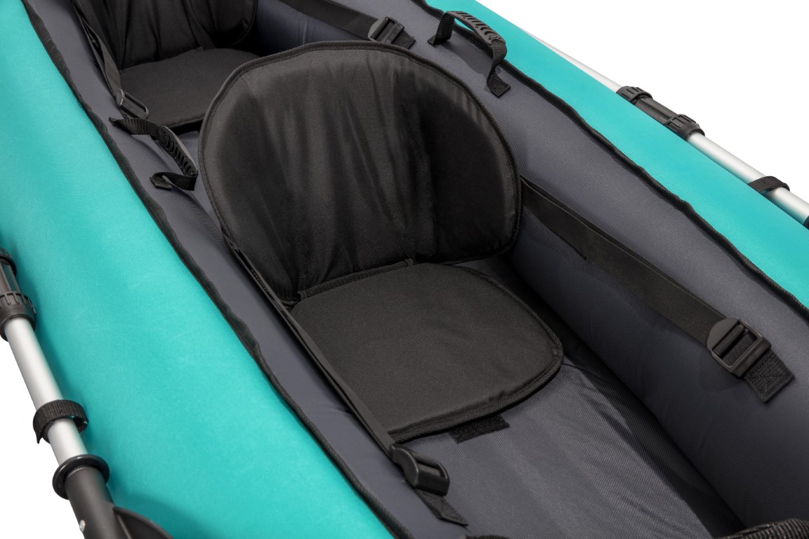 Kahden hengen Ventura-kajakissa on säädettävät selkänojat, jotka tarjoavat miellyttävää tukea ja istuinmukavuutta. Välttämättömät tarvikkeet, kuten juomavesi ja eväät, saa kätevästi mukaan useisiin säilytystiloihin, jotka ovat helposti käden ulottuvilla. Lisäksi mukana toimitetaan irrotettava säilytyspussi, joka mahdollistaa nopean pääsyn tärkeimpiin varusteisiin meloessasi. Kajakin kaksiteräiset airot ovat kevyttä alumiinia ja ne pysyvät tukevasti paikoillaan turvallisten airolukkojen ansiosta. Kajakin täyteen puhallettu pituus on 3,30 metriä, ja se kantaa jopa 200 kg. Tukevat kangaskahvat kajakin molemmilla sivuilla helpottavat siirtämistä ja käsittelyä. Irrotettavat evät parantavat suuntavakautta ja lisäävät vakautta sekä nopeutta vedessä. Käytön jälkeen evät on helppo irrottaa, jolloin kajakki taittuu kompaktiksi ja on helppo säilyttää tilaa säästävästi.