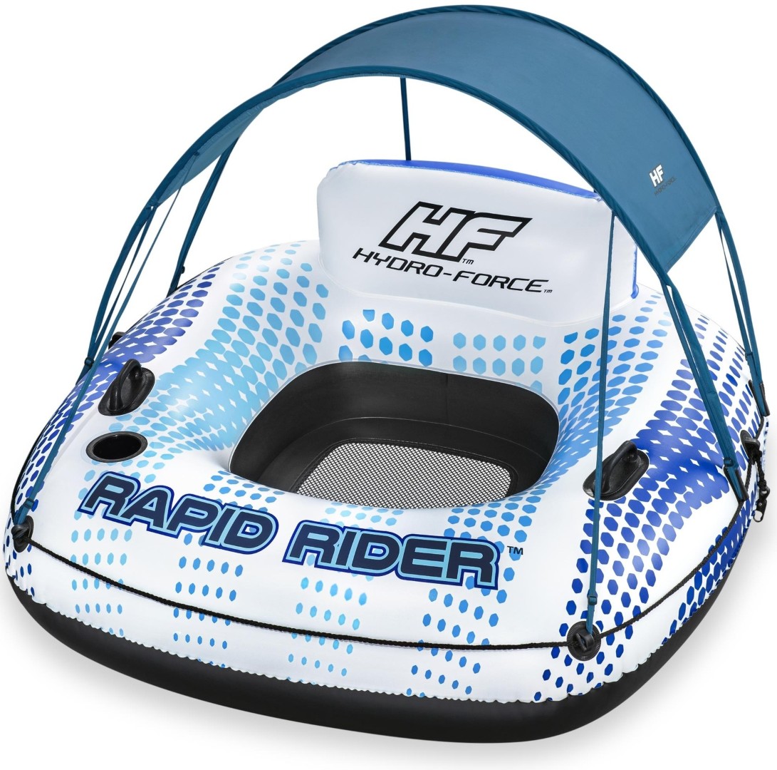 Hydro-Force™ Rapid Rider™ -uimarengas, jossa on irrotettava aurinkovisiiri, on täydellinen tapa viettää rentouttava ja hauska päivä auringossa ja veden äärellä. Tähän raskaaseen putkeen mahtuu yksi aikuinen, ja siinä on Inflata-Shield™-materiaali, joka on puhkeamisen kestävää ja rajoittaa materiaalin laajenemista, jolloin ilma pysyy optimaalisesti sisällä. Putkessa on myös irrotettava aurinkovarjo, joka suojaa sinua auringon voimakkailta säteiltä. Voit myös nauttia suosikkijuomasi sisäänrakennetun mukitelineen avulla, ja tukevat kahvat auttavat sinua pääsemään putkeen sisään ja ulos. Erityisesti suunniteltu viileä verkkoistuin ja ensiluokkainen selkänoja antavat sinulle erityisen mukavan ja rentouttavan nautinnon, kun kellut vedessä. Koko putken ympärillä oleva tartuntaköysi tarjoaa sekä lisäturvallisuutta että helppoutta rantautuessasi, tai voit yhdistää muihin putkiin käyttämällä kahta silmukkaa Clasp 'N Go™-solkea varten, jotka yhdistävät helposti kaksi putkea toisiinsa. Irrotettavalla aurinkovisiirillä varustetulla Hydro-Force Rapid Rider Tube -putkella voit viettää päivän auringossa tai varjossa!