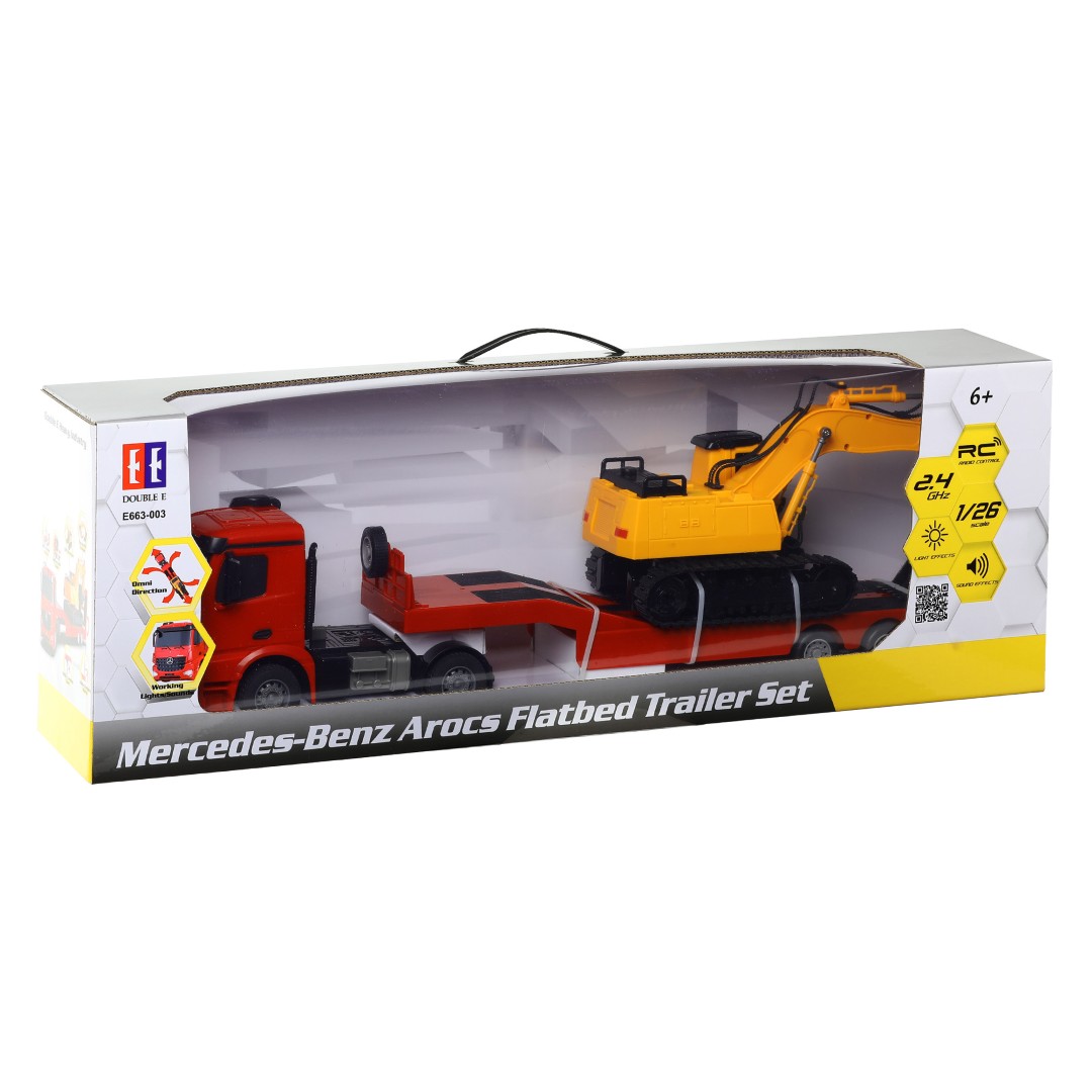 Tämä yksityiskohtainen kauko-ohjattava Mercedes-Benz Arocs -kuorma-auto, jossa on lava-auto ja kaivinkone, on täydellinen lahja pienille urakoitsijoille. Sarja on valmistettu mittakaavassa 1:26 ja siinä on runsaasti realistisia ominaisuuksia. Kuorma-autossa on 2,4 GHz:n tekniikalla varustettu kauko-ohjain, jonka avulla voit ajaa eteen- ja taaksepäin sekä kääntyä vasemmalle ja oikealle ilman häiriöitä.