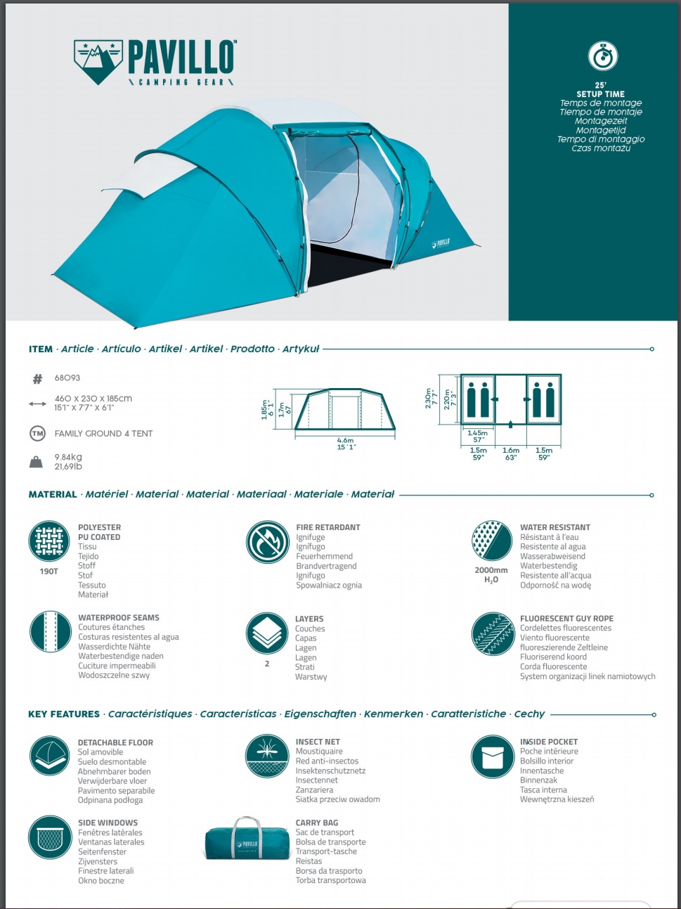 | Tyyppi: | Pavillo Family Ground 4 -teltta 460 x 230 x 185 cm |