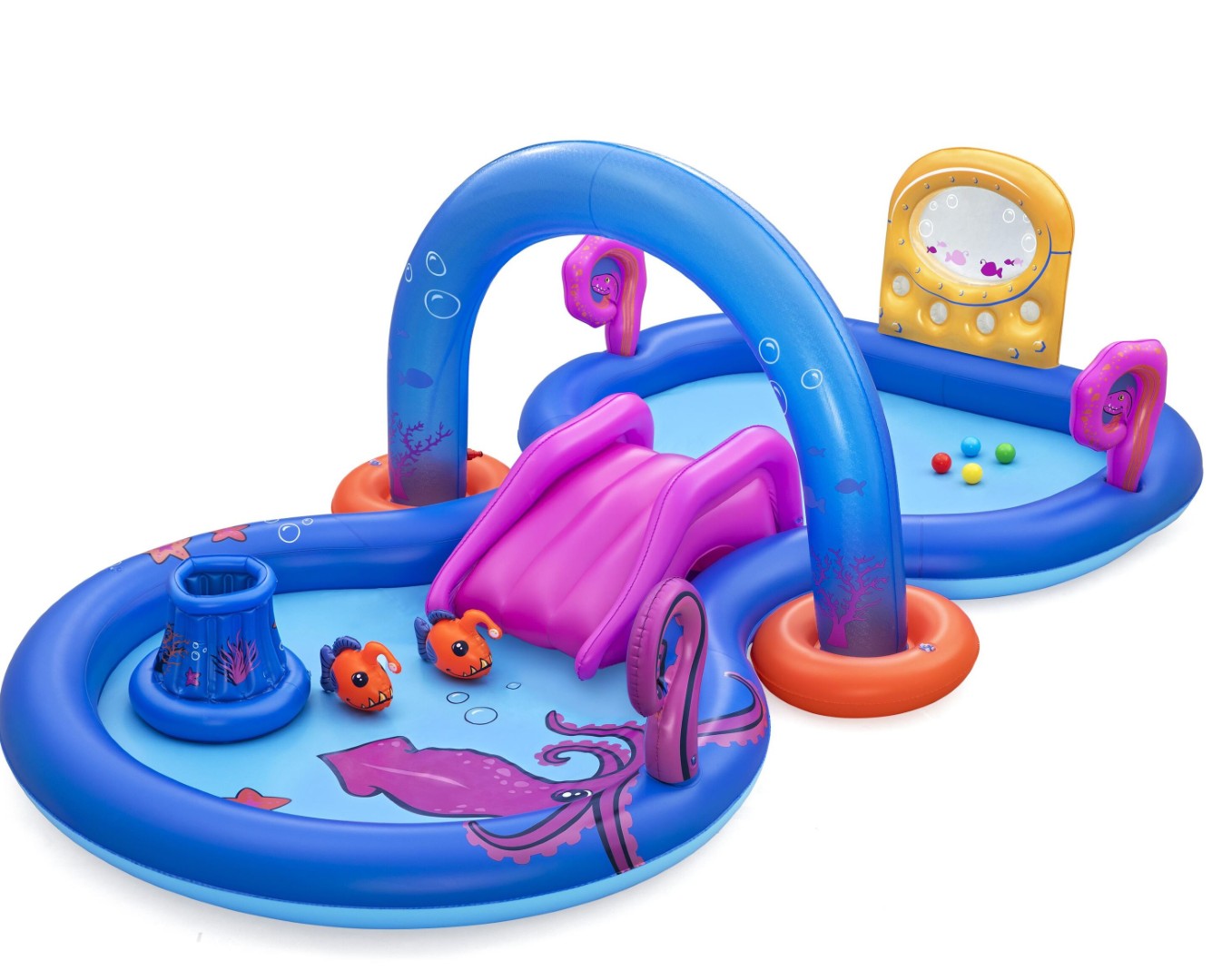 Sukella syvälle hauskanpitoon Bestway® Sea Odyssey™ -leikkikeskuksen kanssa! Tämä syvänmeriteemainen leikkikeskus, jossa on kaksi leikkiallasta ja irrotettava puhallettava liukumäki, tekee lapsesi vedenalaisista unelmista totta. Interaktiivinen pallolajitteluseinä saa lapset tuntemaan olevansa sukellusveneessä tutkimassa syvyyksiä samalla, kun he harjoittavat hienomotoriikkaa asettamalla neljä leikkipalloa seinän aukkoihin. He voivat roiskia tuntikausia pelaten pickleballia kahdella irrotettavalla ankeriasketsillä ja leikkipalloilla. Lapset voivat puolustaa “laivaansa” käyttämällä mustekalan lonkerolinkoa ja yrittää osua liikkuvaan korikoriin leikkipalloilla. Kun on aika vaihtaa leikkiä, he voivat napata kaksi Puffy Pal™ -merikalaa ja heittää ne korikoriin. Sisäänrakennettu, irrotettava kaarisuihku liitetään helposti puutarhaletkuun, jotta vesi ja hauskanpito jatkuvat keskeytyksettä. Leikkikeskuksessa on myös helppokäyttöinen tyhjennysventtiili, joka tekee altaan tyhjentämisestä ja säilytyksestä vaivatonta. Leikkikeskusta voi käyttää myös ilman vettä, joten leikki jatkuu ympäri vuoden. Lapset nauttivat tuntikausien roiskimisesta ja mielikuvitusleikeistä Bestway Sea Odyssey -leikkikeskuksen parissa.