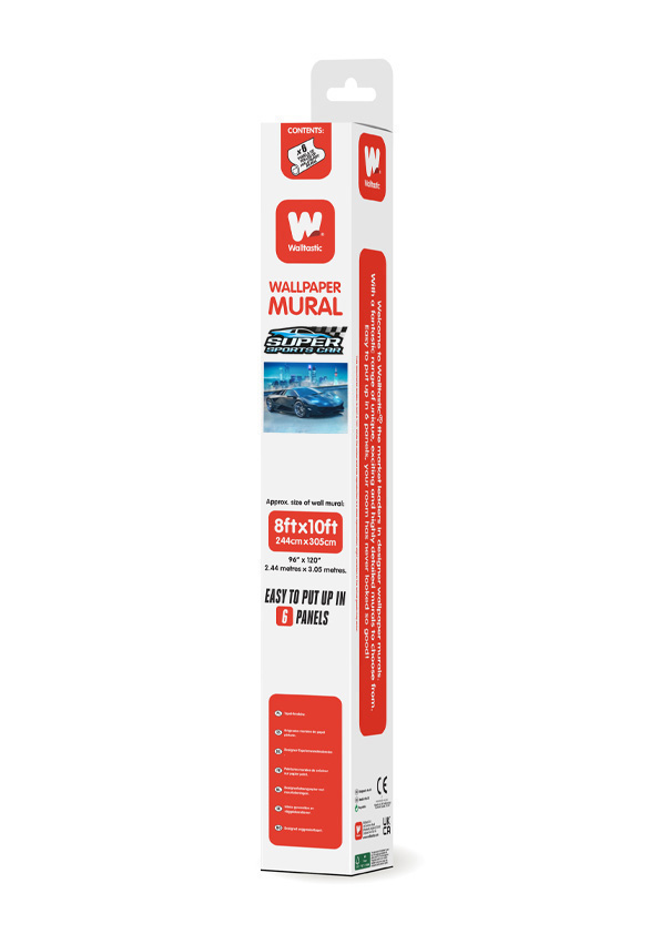 Muunna huoneesi tämän Walltasticin Super Sports Car -tapetin avulla. Koko 243,84 cm x 304,80 cm. Toimitetaan 6 paneelissa, joten se on helppo levittää ja joustava sen suhteen, kuinka paljon tilaa se peittää, ja se toimitetaan lahjapakkauksessa, joka on rullattu kuin tapetti.