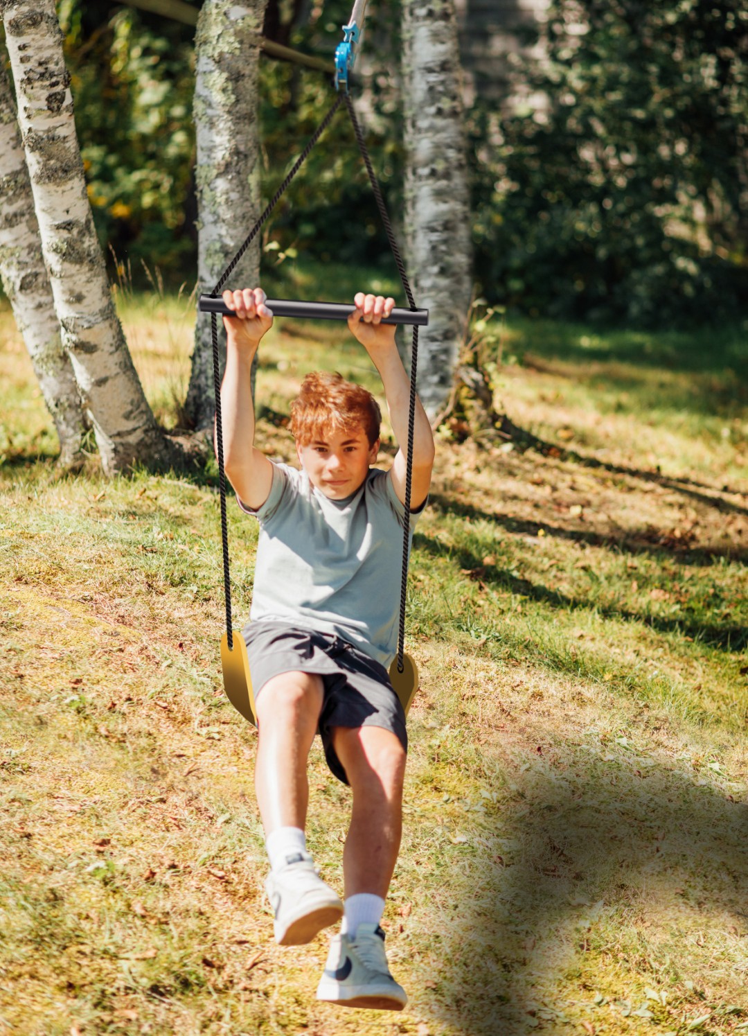 Monkeybar (25 cm metallia), jossa vyökiikku, delta-karabiini ja kaksi soikeaa karabiinia - hauskaa ja monipuolista kokemusta varten. Käytä monkeybaria yksinään tai yhdessä kiikan kanssa lisäturvallisuutta varten.